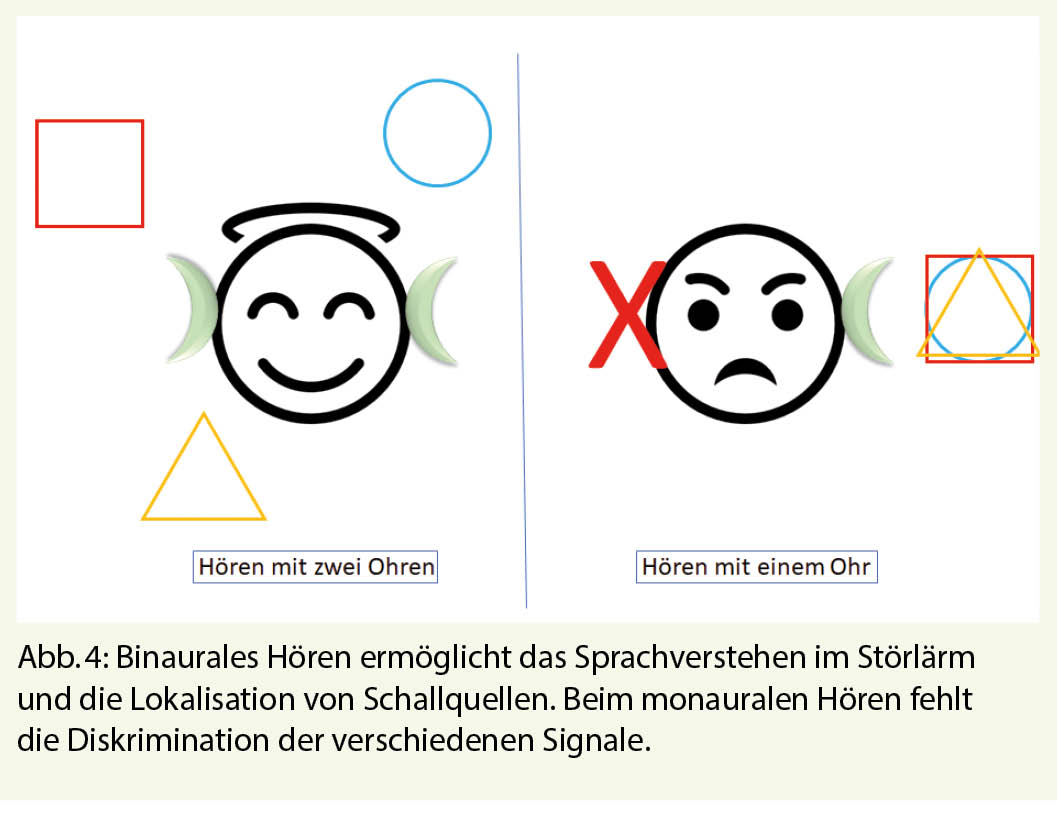 Patienten mit einer einseitigen Ertaubung und normalhörendem Gegenohr fühlen sich bei einem Zwiegespräch in ruhiger Umgebung und Augenkontakt mit Sicht auf die Mimik wenig bis gar nicht beeinträchtigt. Sobald jedoch die üblichen Anforderungen an das Hören im praktischen Alltag vorliegen, macht sich die Einseitigkeit bemerkbar. Das monaurale, asymmetrische Hören führt nämlich zu deutlichen Einschränkungen vor allem beim Sprachverstehen im Störlärm und bei der Lokalisation von Schallquellen. Hören wird anstrengend (Abb. 4). Gerade in der aktuellen Situation einer Pandemie mit dem Tragen von Gesichtsmasken wird die Herausforderung noch grösser.