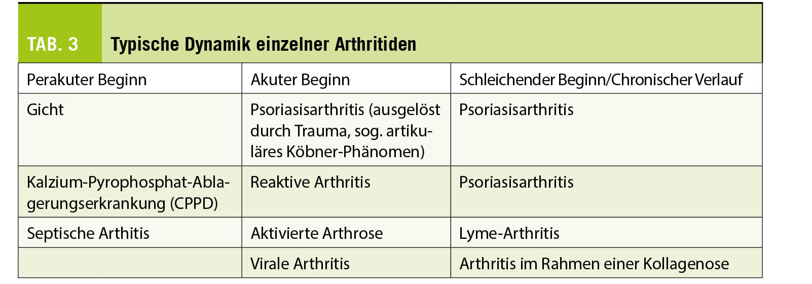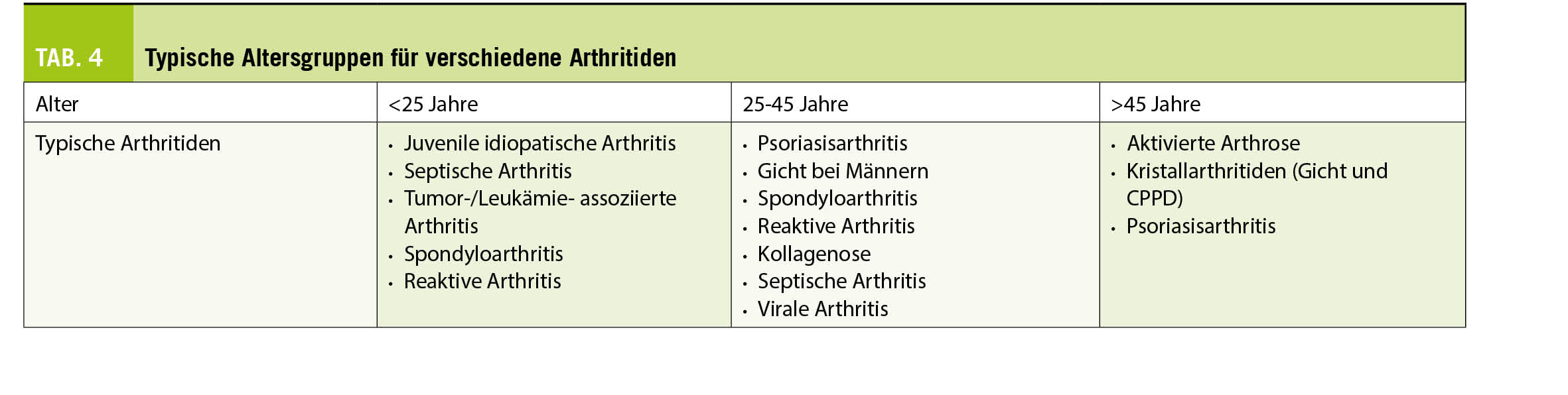 Dynamik und Umstände einer Arthritis geben oft gute Hinweise auf die Ätiologie. Als Beispiel: Eine über Nacht aufgetretene stark schmerzhafte und gerötete Schwellung des MTP-Gelenkes 1 bei einem übergewichtigen 50-jährigen Mann nach einem üppigen Mahl am Vorabend lässt wohl alle Leser an eine Gicht denken. Ändert man nun aber nur schon diesen Patienten in eine 20-jährige schlanke Frau, bestehen berechtigte Zweifel an einer Gicht. In Tabelle 3 ist die typische zeitliche Dynamik verschiedener Arthritiden aufgeführt. Tabelle 4 zeigt eine mögliche Einteilung der Arthritiden nach Altersgruppen, in denen diese typischerweise auftreten. Natürlich kann eine Erkrankung auch in einer dafür atypischen Altersgruppe auftreten. Insbesondere bei Kristallarthritiden, die «zu früh» auftreten, sollte an eine zugrundeliegende Ursache gedacht werden (z.B. Hämochromatose als Ursache einer CPPD).