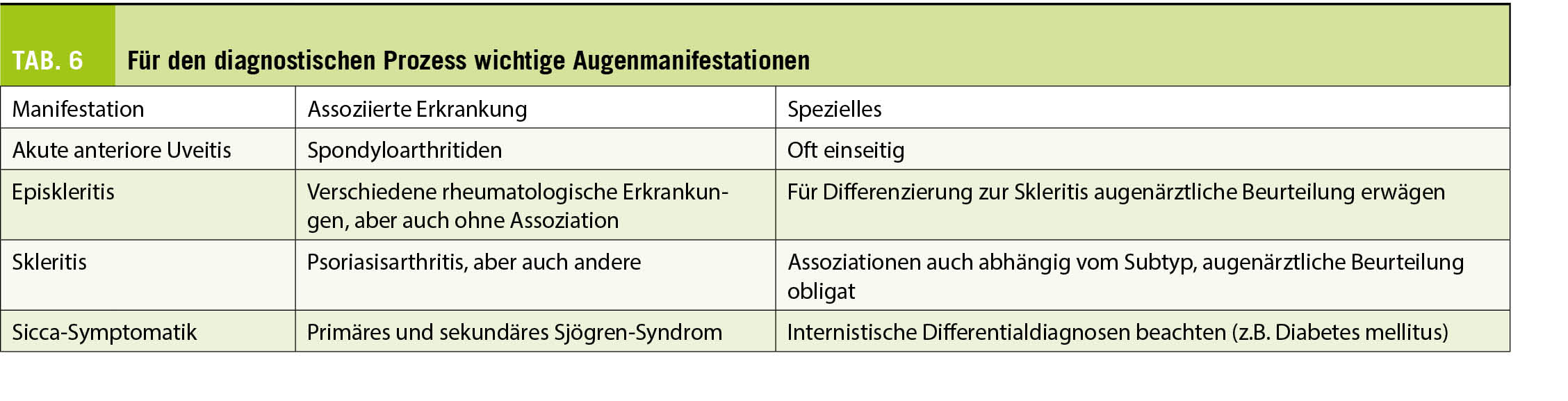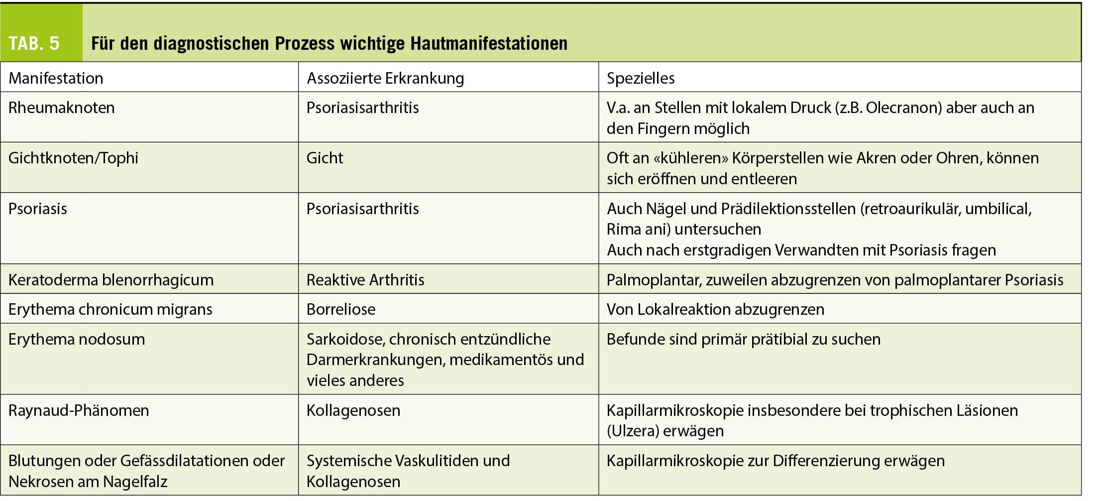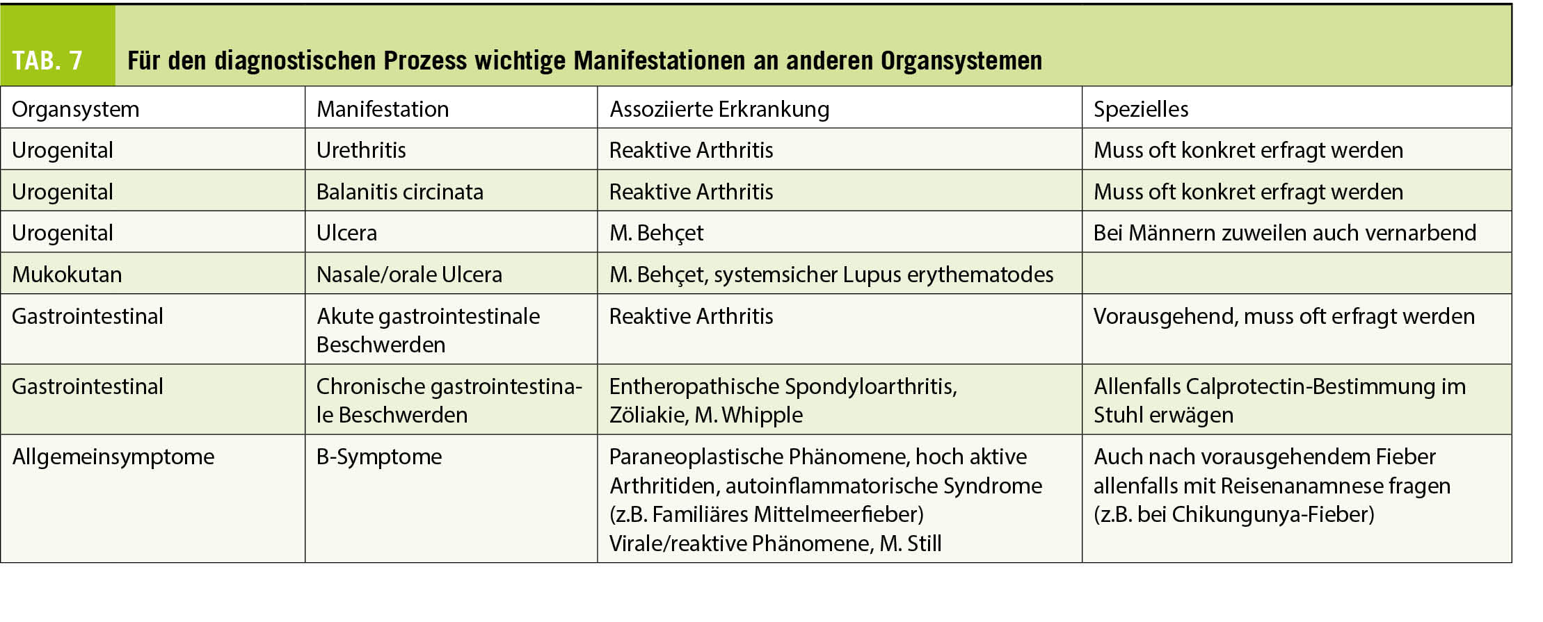 Viele rheumatologische Erkrankungen sind nicht nur auf die Gelenke limitiert. Die Ausprägung der extraartikulären Symptome kann sehr unterschiedlich sein. Diese können für die Betroffenen im Vordergrund stehen oder aber auch gar nicht erst als eigentliche Beschwerden wahrgenommen werden. Nicht selten stellen die Betroffenen auch bei störenden extraartikulären Beschwerden keine Verbindung zum artikulären Geschehen her und berichten entsprechend auch nicht spontan davon. Eine gut strukturierte Systemanamnese hilft die wichtigsten Organsysteme abzudecken. Tabellen 5-7 fassen häufige und diagnostisch hilfreiche Befunde zusammen. Bei gewissen Erkrankungen wie der Psoriasis lohnt sich auch eine Familienanamnese. Zuweilen kann bei Verwandten eine sogenannte «Arthritis psoriatica sine psoriase», also Arthritis ohne eigentliche Hautmanifestationen auftreten.