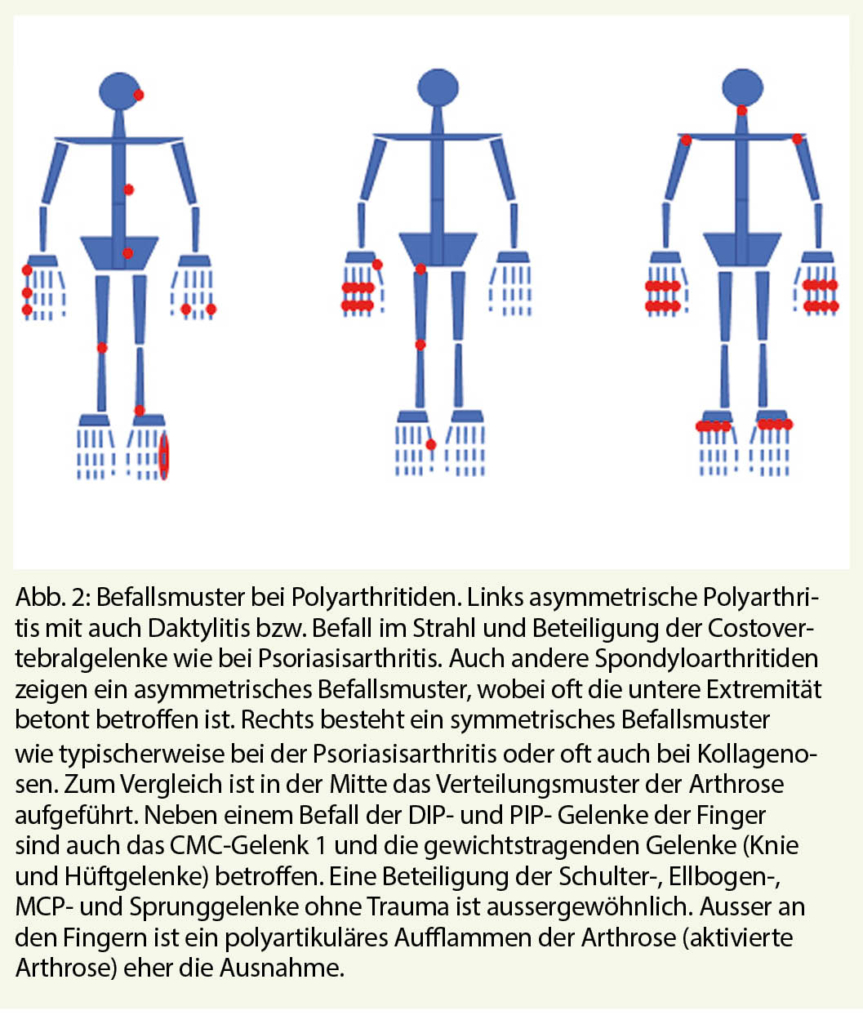 Nicht nur die Anzahl der betroffenen Gelenke, sondern auch deren Verteilung ist wichtig. Der Befall gewisser Gelenke gibt bereits eine differentialdiagnostische Richtung vor, was in Tabelle 2 ausgeführt wird. Bei der Verteilung sind die vorhandene oder fehlende Symmetrie, die vorwiegend axiale oder periphere Verteilung, sowie auch der Befall im Strahl (mehrere Gelenke eines Fingers oder Zehs) von grosser Relevanz. Abbildung 2 zeigt schematisch typische Verteilungsmuster auf. Speziell hervorzuheben ist der Befall im Strahl, der oft als Daktylitis (zusätzliche Entzündung der periartikulären Strukturen) auftritt und recht charakteristisch für die Psoriasisarthritis und andere Spondyloarthritiden ist, aber z.B. auch bei der Sarkoidose auftreten kann. Die aktivierte Arthrose ist eine wichtige Differentialdiagnose der Monarthritis. Insbesondere die Fingerpolyarthrose muss von anderen Polyarthritiden wie der Psoriasisarthritis (DIP-Gelenke) oder rheumatoiden Arthritis (PIP-Gelenke) abgegrenzt werden. Ausserdem gibt es einige Gelenke, welche selten bis nie von einer primären Arthrose betroffen sind. Hierbei sind insbesondere die Schulter-, Ellbogen-, Hand- und MCP-Gelenke sowie die OSG und MTP-Gelenke 2-5 zu erwähnen. Wenn in dieser Lokalisation eine Arthrose gefunden wird, soll eine ursächliche strukturelle Läsion oder systemische (auch metabolische) Grunderkrankung in Erwägung gezogen werden.