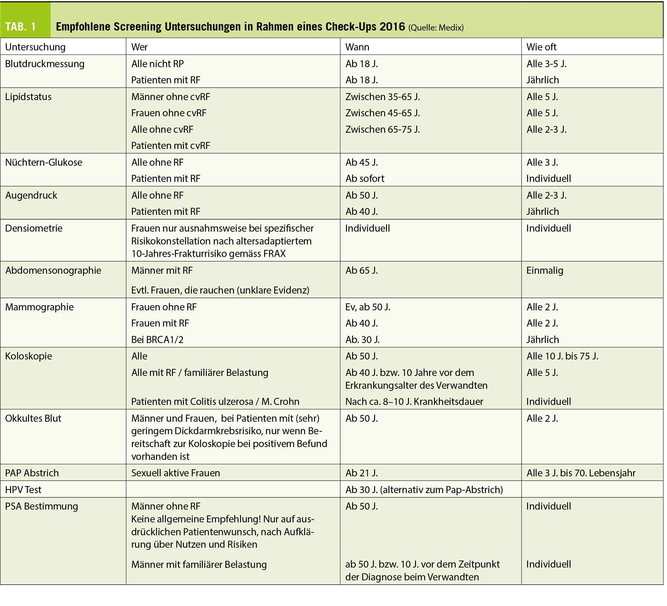 Grundsätzlich gehören zum Check-up die Anamnese, klinische Untersuchungen, Laboruntersuchungen und apparative Untersuchungen. Welche Untersuchungen vorgenommen und wie das Grundprogramm ergänzt wird, sind von Anamnese, Symptomen, Lebensstil und dem Untersucher abhängig (Tab. 1). Check-ups werden daher sehr unterschiedlich durchgeführt. Ähnlich wie z.B. in der Orthopädie, wo der Outcome einer Hüft-TP vom Operateur und dem chirurgischen Zentrum abhängig ist, wird die Qualität und das Nutzen eines Check-ups stark vom Arzt beeinflusst.