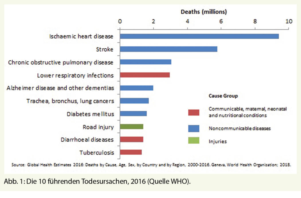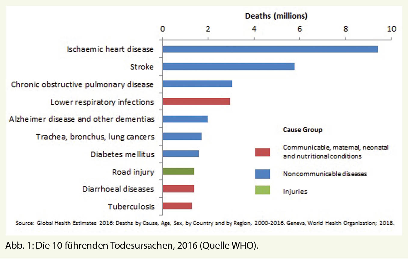 Bluthochdruck ist bekannterweise einer der wichtigsten kardiovaskulären Risikofaktoren mit einer hohen Prävalenz in der Schweiz und weltweit (Abb. 1). 60% der über 60-Jährigen und 80% der über 75-Jährigen sind hyperton. Die frühzeitige Diagnose und Behandlung der Hypertonie und deren Risikofaktoren wie Adipositas und Dyslipidämie kann das Auftreten von Folgekrankheiten wie Koronare Herzerkrankungen, Schlaganfall oder Nephropathien deutlich verringern. Leider sind jedoch bis 80% der Patienten mit einer arteriellen Hypertonie suboptimal eingestellt und profitierten so indirekt vom Check-up (10). Weitere Risikofaktoren, die während eines Check-ups anamnestisch erhoben werden, sind familiäre Belastungen, erhöhter Alkoholkonsum, Nikotinkonsum und Bewegungsmangel.