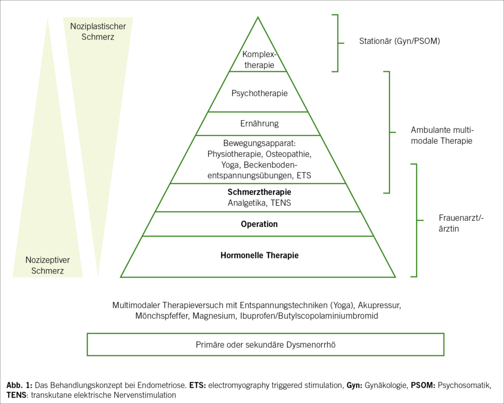 Im Rahmen der Veranstaltung referierte Frau Dr. Barbara Lungner über die Endometriose sowie die entsprechenden Schmerztherapien. Die Endometriose wird definiert als chronisch-entzündliche Erkrankung, bei der sich endometriumähnliches Gewebe ausserhalb des Uterus befindet. Das Durchschnittsalter bei der Diagnose liegt bei 28 Jahren, wobei Endometriose auch bereits im Jugendalter auftreten kann. In seltenen Fällen ist auch die Diagnose bei kleinen Mädchen möglich. Es ist zu beobachten, dass die Diagnose häufig erst nach einem Zeitraum von über fünf Jahren gestellt wird. Unter geeigneter Therapie lässt sich die Diagnose günstig stellen. Jede zehnte Frau ist von dieser Erkrankung betroffen, wobei eine familiäre Häufung beobachtet wird. Die Prävalenz des superfizialen peritonealen Befalls liegt bei ca. 80 %, wobei auch eine ovarielle Manifestation in Form von Zysten beobachtet wird. Die Lokalisationen der Erkrankung sind vielfältig und können tief im Peritoneum, aber auch kombiniert auftreten. Zudem kann eine Erkrankung des Blasenepithels sowie extrapelviner Regionen, wie beispielsweise thorakal, umbilikal oder zerebral, erfolgen.Das Behandlungskonzept ist in Abb. 1 wiedergegeben.