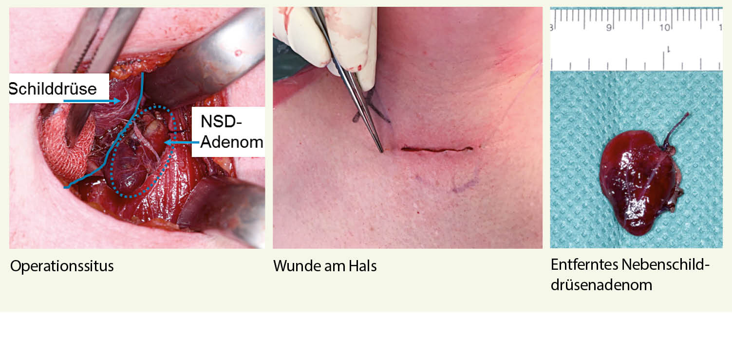 10 Minuten nach Entfernung des Nebenschilddrüsenadenoms, muss nach einer weiteren erkrankten Nebenschilddrüse gesucht werden. Der Eingriff muss also erweitert werden. Auch ein intraoperativer Schnellschnitt kann hilfreich sein, insbesondere, wenn die Identifizierung des Nebenschilddrüsenadenoms aspektmässig nicht einwandfrei möglich ist.