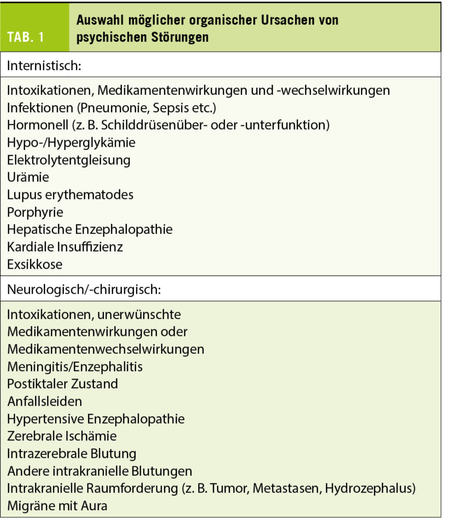 Die Kernfragen bei der Diagnostik psychiatrischer Notfälle betreffen immer wieder die Einschätzung von vitaler Gefährdung, bestehender Eigen- oder Fremdgefährdung, somatischer oder psychiatrischer bzw. stationärer oder ambulanter Behandlungsnotwendigkeit. Bevor jedoch konkret von einem psychiatrischen Notfall oder Krise in der Hausarztpraxis ausgegangen werden kann, muss eine organische (Mit)genese ausgeschlossen respektive ursächlich behandelt werden. Dazu gehört eine so ausführliche Anamnese wie möglich, ein Somatostatus sowie eine Routine-Laboruntersuchung inklusive Drogenscreening (4).
