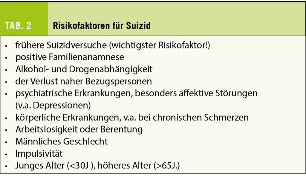 Suizidversuchen in der Anamnese oder chronischen körperlichen Erkrankungen muss an Suizidalität gedacht werden.