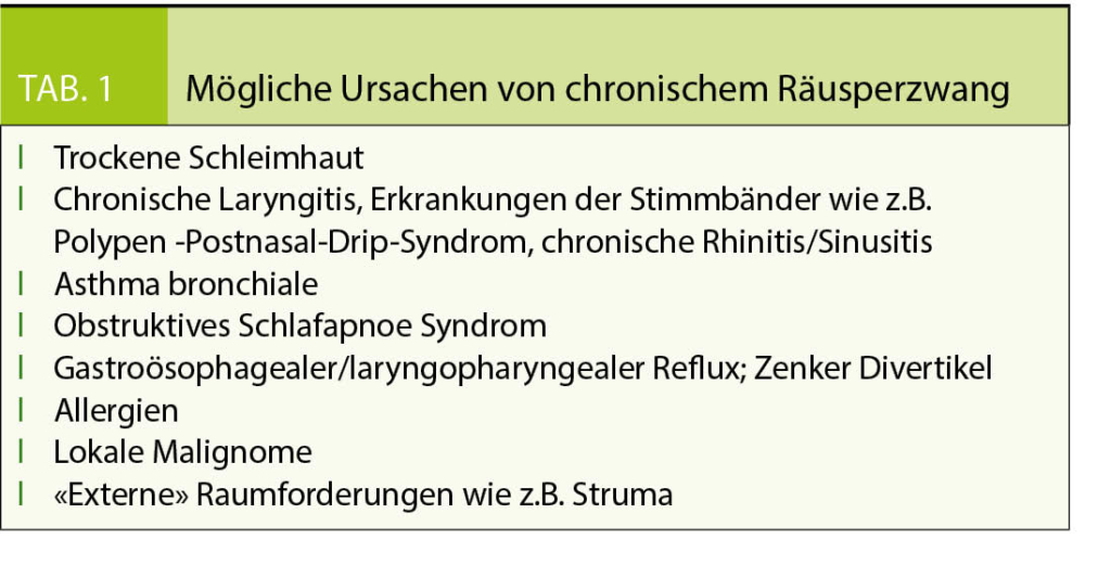 Im Zentrum des Krankheitsgeschehens steht die trockene Rachenschleimhaut. Täglich werden im Bereich der oberen Atem- und Speisewege physiologisch ca. 1,5 l Schleim gebildet. Dieser Schleim bildet einen feinen Film auf der Schleimhaut, welcher neben der protektiven Wirkung auch die Gleitfähigkeit der Schleimhaut beim Schlucken sicherstellt. Wird zu wenig Schleim gebildet, nimmt dessen Viskosität zu. Der Schleimfilm ist zäh und haftet auf der Schleimhaut, was zum Fremdkörpergefühl und Zwang des Räusperns führt. Dabei kann zäher, mehr oder weniger farbloser Schleim ausgespuckt werden. Auch eine Überproduktion von Schleim kann die Beschwerden verursachen, da dieser Schleim lokal ebenso als «Fremdkörper» irritieren kann und hinausbefördert werden muss. Als mögliche Ätiologie der Beschwerden muss neben lokalen laryngealen Veränderungen an entzündliche und nicht-entzündliche Erkrankungen der Nachbarorgane gedacht werden (Tonsillen, Nase, Nasennebenhöhlen, gastroösophageale Refluxerkrankung, Zenker-Divertikel, obstruktives Schlafapnoe-Syndrom). Eine der häufigsten Ursachen des Räusperns ist das Postnasal-Drip-Syndrom (PNDS), wobei aufgrund von besonders zähflüssigem Schleim ein andauerndes Fremdkörpergefühl im Hals entsteht. Ein PNDS tritt oft während oder nach viralen oberen Atemwegsinfekten auf. Dauerhafte Entzündungen der Atemwege wie z.B. Asthma bronchiale können zu einer Überempfindlichkeit und Schwellung der Schleimhäute führen und eine Schleimüberproduktion mit häufigem Husten- und Räusperzwang, pfeifenden Atemgeräuschen, einem obstruktiven Bild mit verlängertem Exspirium und in stärkerer Ausprägung Dyspnoe und thorakalem Engegefühl nach sich ziehen. Weitere mögliche Ursachen von chronischem Räuspern sind gastroösophagealer bzw. laryngopharyngealer Reflux, wobei der Reflux von Magensäure die Schleimhäute irritiert, sowie Allergien und selten auch komprimierende Raumforderungen wie z.B. eine Struma. Eine Zusammenstellung der verschiedenen Ursachen ist in Tabelle 1 aufgeführt. 40% aller Patienten mit chronischem Husten bzw. Räusperzwang leiden an PNDS, Reflux oder Asthma, oder auch an einer Kombination aller Beschwerden, welche im Einzelnen vielleicht asymptomatisch gewesen wären, in der Gesamtheit aber zu einer signifikanten laryngealen Reizung und zu einem chronischen Zustand geführt haben. Begünstigt werden die Beschwerden durch ein zu trockenes Ambiente, ungenügende Trinkmenge, Noxen wie Nikotin, Alkohol, Chemikalien, Staub, Medikamente sowie Mundatmung bei behinderter Nasenatmung.