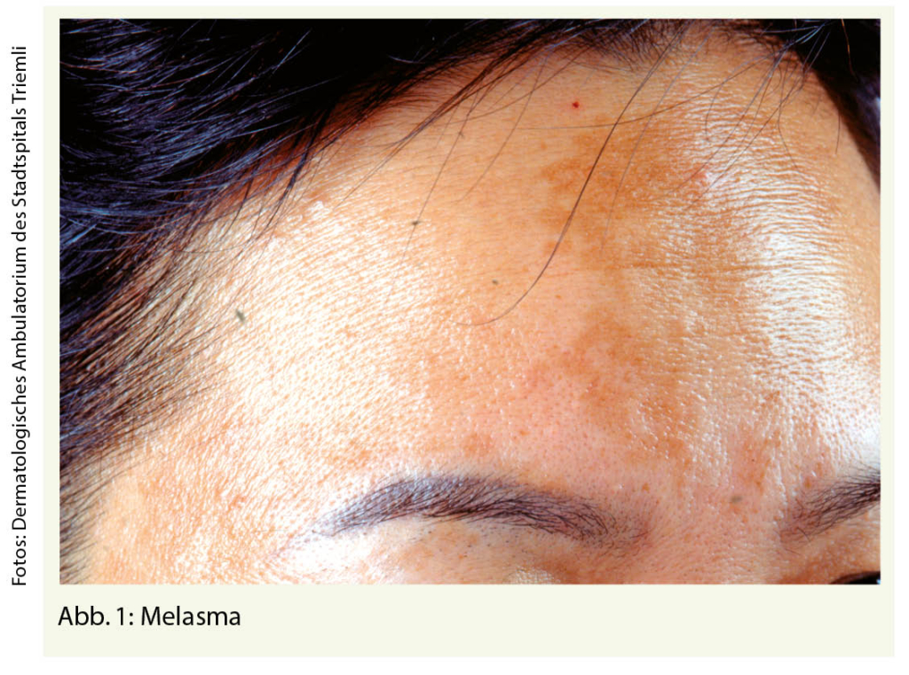 Die häufigsten physiologischen Veränderungen betreffen die Pigmentierung, das Haarwachstum sowie das Gefässsystem. Tab. 1 (1) gibt einen Überblick über diese Erscheinungen. Abbildung 1 zeigt das Melasma.