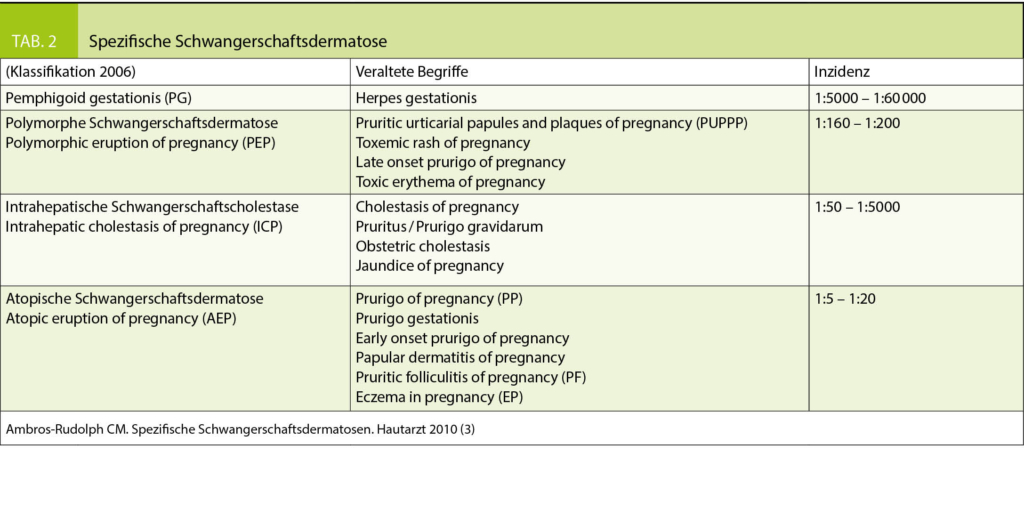 Als Schwangerschaftsdermatosen werden heute 4 Hauterkrankungen bezeichnet. Die aktuelle Klassifikation wurde 2006 von Ambros-Rudolph et al. (2) etabliert und fasst die früher verwendeten Bezeichnungen übersichtlich zusammen. In Tabelle 2 sind die aktuelle Klassifikation und die veralteten Synonyme dargestellt (3).