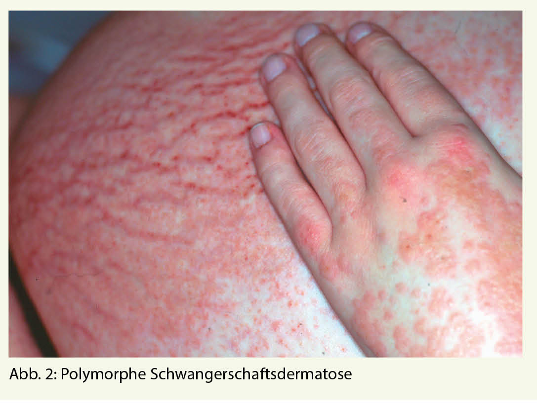 Die PEP ist eine häufige Schwangerschaftsdermatose und kann unterschiedliche klinische Bilder aufweisen. Die meisten Patientinnen weisen «juckende (pruritic) urticarielle Papeln und Plaques» auf, weshalb die Erkrankung früher als PUPPP bezeichnet wurde. Einige Betroffene präsentieren sich aber auch mit flächigen Erythemen und im Krankheitsverlauf kann es zu ekzematösen Läsionen, polyzyklischen Erythemen oder targetoiden bis multiforme-artigen Läsionen kommen. Es sind fast ausschliesslich Erstgebärende mit einem typischen Auftreten in den letzten Schwangerschaftswochen oder sogar postpartal betroffen. Bei Mehrlingsschwangerschaften tritt die Dermatose gehäuft auf. Die PEP beginnt mit starkem Juckreiz und mit erythematösen oder ödematösen Papeln und Plaques innerhalb der Striae distensae. In der Folge kommt es zur Ausbreitung auf Abdomen, Gesäss und Extremitäten (Abb. 2 und 3). Die periumbilikale Region bleibt ausgespart, dies ist ein wichtiges Abgrenzungsmerkmal zum Pemphigoid gestationis. Im Zweifelsfall kann eine Biopsie mit direkter Immunfluoreszenz durchgeführt werden. Hiermit gelingt eine eindeutige Abgrenzung zum PG. Die durchschnittliche Dauer bis zur Abheilung beträgt 4-6 Wochen. Rezidive in folgenden Schwangerschaften sind mit Ausnahme von Mehrlingsschwangerschaften nicht zu erwarten und ein fetales Risiko besteht nicht. Topische Kortikosteroide und systemische Antihistaminika sind in der Regel ausreichend, selten wird ein systemischer Steroidstoss benötigt. Weiter können unterstützend Menthol- oder Polidocanol haltige Externa eingesetzt werden.