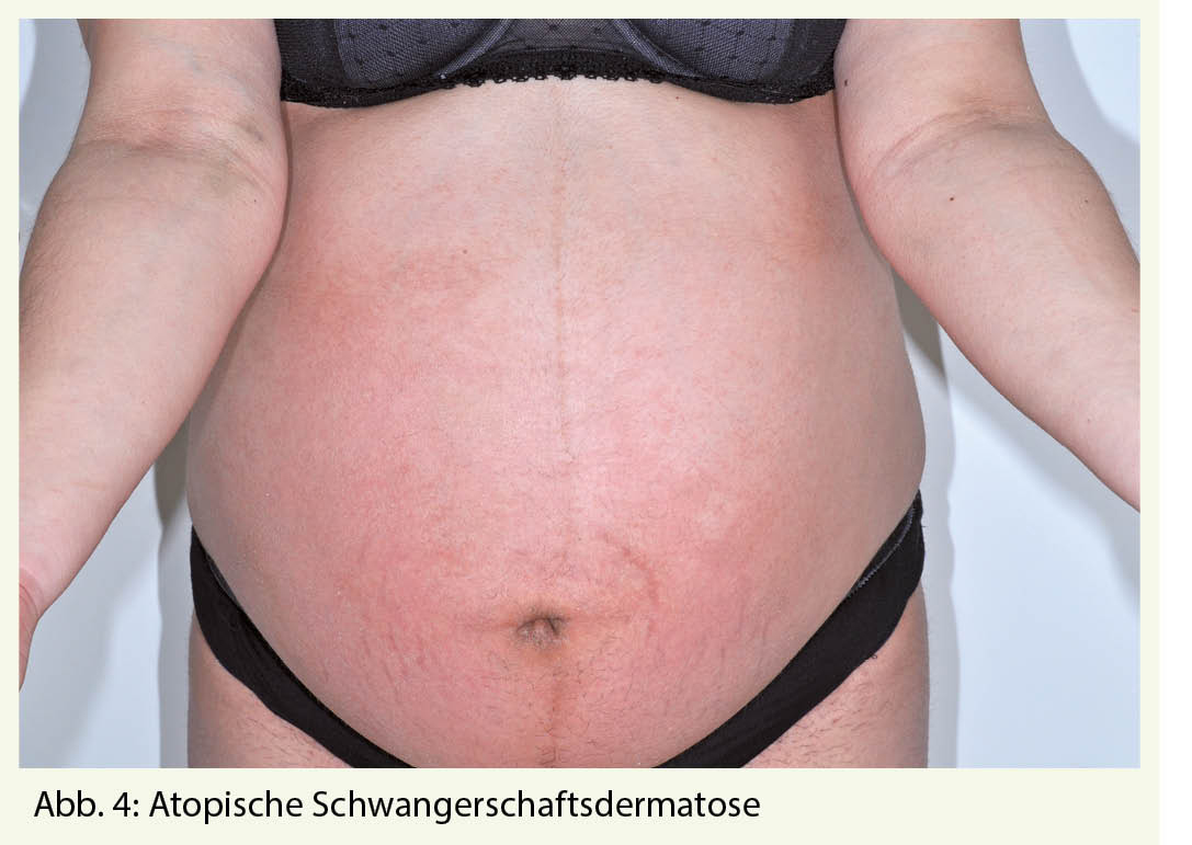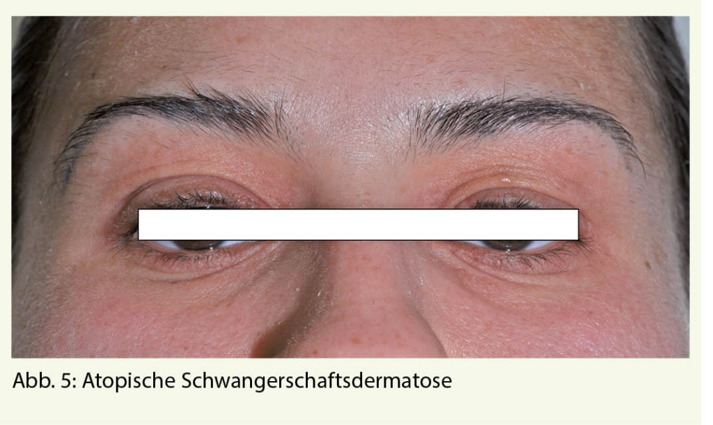 Die Atopische Schwangerschaftsdermatose ist die häufigste Ursache für Pruritus in der Schwangerschaft. Wahrscheinlich handelt es sich um eine Manifestationsform des atopischen Ekzems in der Schwangerschaft. Viele Patientinnen haben eine positive Eigen-oder Familienanamnese für Atopie und einen erhöhten gesamt IgE-Wert im Serum. In einem Fünftel der Fälle handelt es sich wahrscheinlich um eine Exazerbation eines vorbestehenden Atopischen Ekzems, beim Restanteil kommt es allerdings in der Schwangerschaft erstmals zum Auftreten von atopischen Hautveränderungen. Pathophysiologisch spielt die in der Schwangerschaft dominante Th2-Immunantwort eine Rolle. Da die Atopische Dermatitis eine typische Th2 dominante Erkrankung ist, scheint es naheliegend, dass eine solche in der Schwangerschaft ausgelöst werden oder sich verschlechtern kann. Der Beginn liegt meist vor dem dritten Trimester. Die AEP wird in zwei Typen unterteilt: Der E-Typ kommt bei 2/3 der Betroffenen vor und geht mit ekzematösen Hautveränderungen an den für die Atopische Dermatitis typischen Stellen einher. Involviert sind meist Gesicht, Hals und Gelenkbeugen (Abb. 4 und 5). Bei einem Drittel der Fälle liegt der P-Typ vor. Hier finden sich disseminierte kleinpapulöse Läsionen an Extremitäten und Stamm oder Prurigoläsionen insbesondere an den Extremitätenstreckseiten. Nach der Geburt kommt es üblicherweise zur spontanen Abheilung, gelegentlich wird aber auch eine Persistenz über Monate beobachtet. Rezidive in weiteren Schwangerschaften sind aufgrund der persistierenden Atopischen Diathese häufig. Ein assoziiertes kindliches Risiko besteht nicht. Zur Behandlung kommen kühlende hydrophile Lotionen, Crèmes oder Schüttelmixturen evtl. mit 2% Menthol- oder Polidocanol-Zusatz in Frage. Schwache bis mittelstarke lokale Kortikosteroide können ebenfalls eingesetzt werden. Selten ist der Einsatz von systemischen Glukokortikoiden oder H1-Antagonisten nötig. Nach Abheilung ist eine pflegende Rückfettung weiter zu empfehlen, da meist auch eine ausgeprägte Xerodermie besteht.