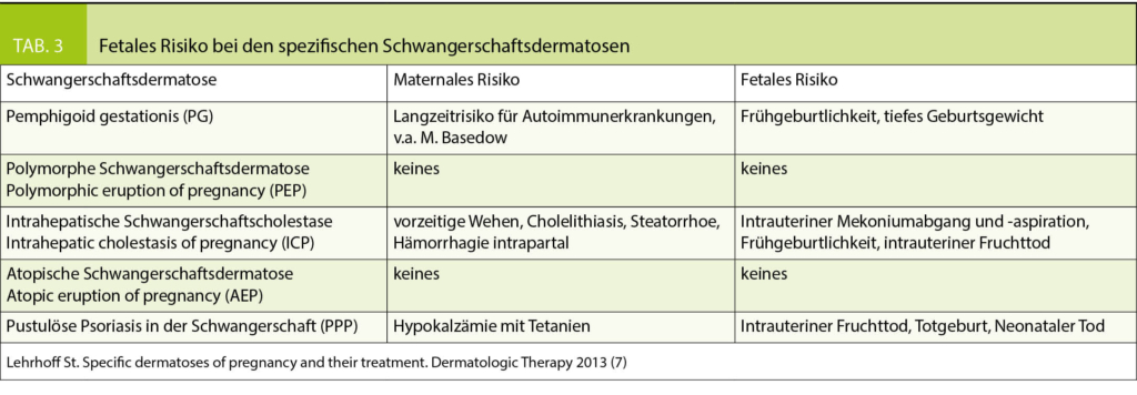 Tabelle 3 fasst das maternale und fetale Risiko bei den spezifischen Schwangerschaftsdermatosen zusammen (7).