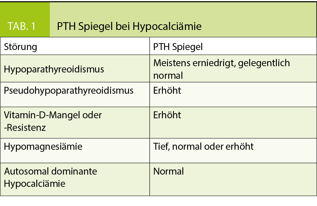 Bei einer asymptomatischen Hypocalciämie sollte für die weitere Differenzierung die Messung von Calcium, Albumin und Phosphat erfolgen. Wenn der Albumin-korrigierte Calcium-Spiegel < 2.05 mmol/l liegt, sollte die Ursache weiter abgeklärt werden. Bei tiefem Phosphat findet sich meistens ein sekundärer Hyperparathyreoidismus aufgrund eines Vitamin-D Mangels. Bei hohem Phosphat und normaler Nierenfunktion liegt meist ein Hypoparathyreoidismus oder Pseudohypoparathyreoidismus vor.