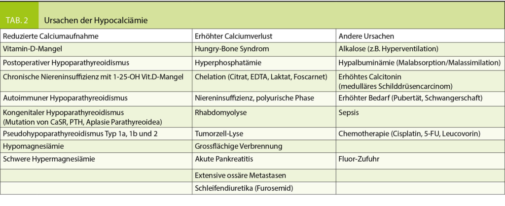 Mehrere Medikamente (z.B. Cisplatin, 5-Fluorouracil, Leucovorin) können zu einer Hypocalciämie führen durch Reduktion des Magnesiumspiegels. Schleifendiuretika (Furosemid) erhöhen die Calcium-Ausscheidung. Zudem kommt es zur Chelat-Bildung von Calcium in der Zirkulation durch EDTA, Citrat und Laktat mit Reduktion des ionisierten Calciums. Extensive Skelettmetastasen (v.a. Prostata- und Mamma-Carcinom) können ebenfalls eine Hypocalciämie verursachen. Bei Sepsis kann es aufgrund der Hypalbuminämie zur Hypocalciämie kommen (Tab. 2).