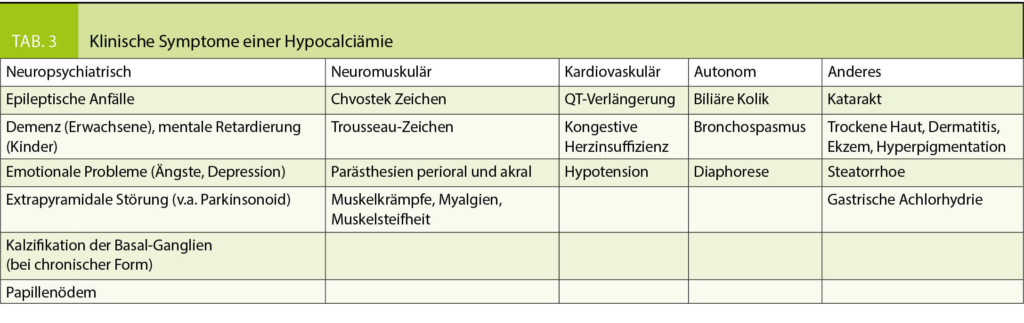 Die moderate Hypocalciämie ist meistens asymptomatisch. Eine akute Hypocalciämie führt zu neuromuskulärer Instabilität mit den typischen muskulären Symptomen bis hin zur Tetanie. Mildere Formen der neuromuskulären Irritabilität sind Parästhesien sowie Taubheitsgefühl perioral und akral. Das Chvostek-Zeichen mit muskulärer Zuckung ipsilateral perioral, nasal und periorbital kann ausgelöst werden durch Klopf-Provokation des Fazialisnervs präaurikulär. Das Trousseau -Zeichen ist ein carpaler Spasmus ausgelöst durch Ischämie bei der Blutdruckmessung oder der Alkalose bei Hyperventilation. Spontane Muskelkrämpfe werden häufig beobachtet bei Hypocalciämie. Prolongierte Kontraktionen der respiratorischen und laryngealen Muskeln kann zu Stridor führen mit möglicher Zyanose (Tab. 3).