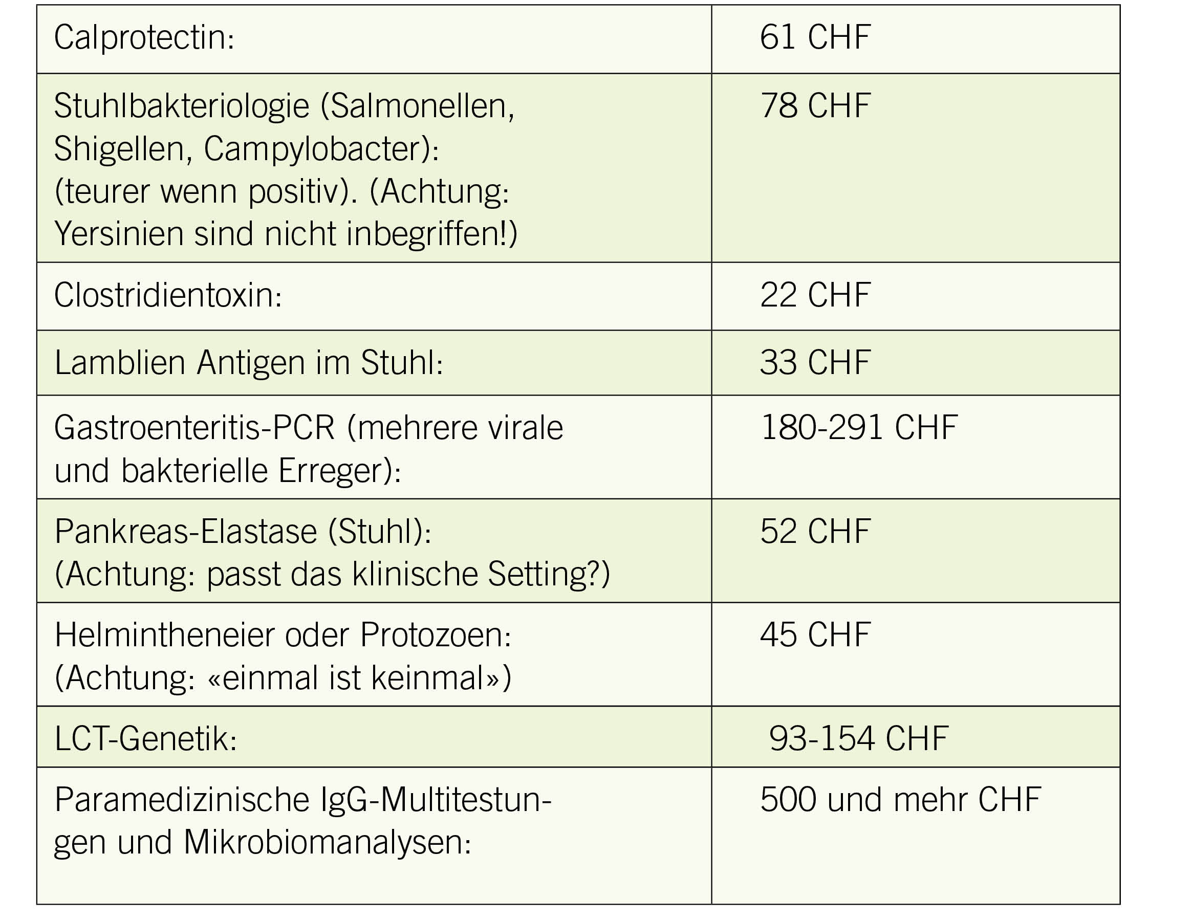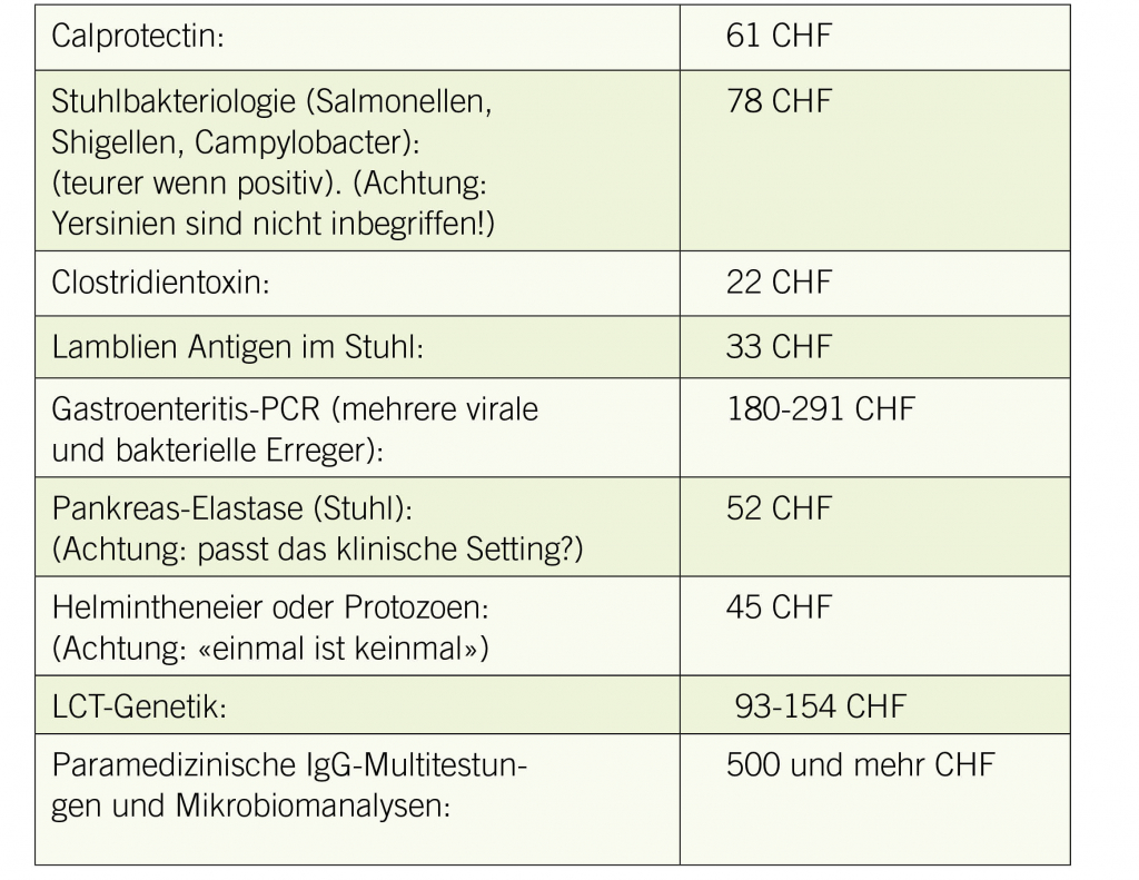 - Seien Sie sich der Preise bewusst, bevor Sie eine Abklärung starten für neu aufgetretene Durchfälle, die in aller Regel spontan sistieren.