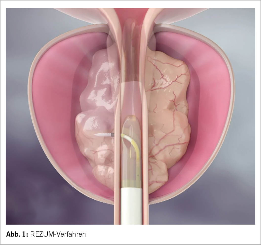 Beim REZUM-Verfahren wird endoskopisch über die Harnröhre mit einer dünnen, ausfahrbaren Nadel 103°C heisser Wasserdampf in das Adenomgewebe der Prostata injiziert (Abb. 1).