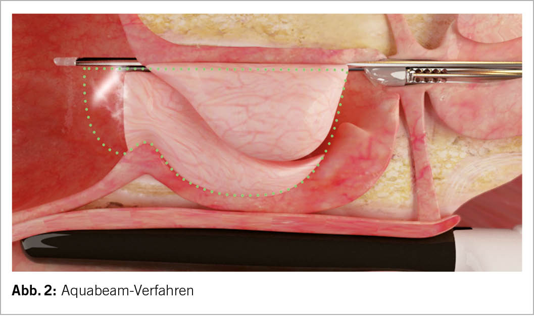 Aquabeam ist ein neues und innovatives Verfahren, welches eine schnelle und kontrollierte Verkleinerung der Prostata ermöglicht (Abb. 2). Mit einem fokussierten Hochdruckwasserstrahl wird das Prostatagewebe ohne thermische Energie abgetragen. Durch eine transrektale Ultraschallsonde kann die millimetergenaue Abtragung entlang der eingezeichneten Grenzen in Echtzeit kontrolliert werden. Falls sich nach der Gewebeabtragung relevante Blutungen aus der Prostata zeigen, kann während der Operation eine Blutstillung mittels bipolarer Kauterisation erfolgen (33). Die WATER-Studie konnte zeigen, dass Aquabeam einer klassischen TURP bezüglich der Verbesserung der Beschwerden nach einem Zeitraum von 3 Jahren nicht unterlegen ist. Hinsichtlich der Sexualfunktion, konnte auch bei diesem Verfahren eine, im Vergleich zur TURP, niedrige Rate an retrograder Ejakulation von lediglich 7.8% beobachtet werden (34). Für beide minimalinvasiven Verfahren stehen Langzeitdaten allerdings noch aus, weshalb diese Verfahren aktuell noch als experimentell angesehen werden müssen.