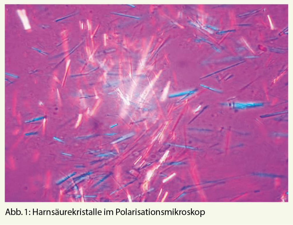 Die Bestimmung der Serumharnsäure ist im Anfall diagnostisch weniger hilfreich (sie kann sogar tiefer sein als ausserhalb eines Anfalles), hingegen ist sie wichtig für die Steuerung der harnsäuresenkenden Basistherapie. Erhöhte Entzündungszeichen (CRP, BSR) und eine Leukozytose passen gut zu einer akuten Gichtentzündung, sind aber natürlich nicht spezifisch dafür.