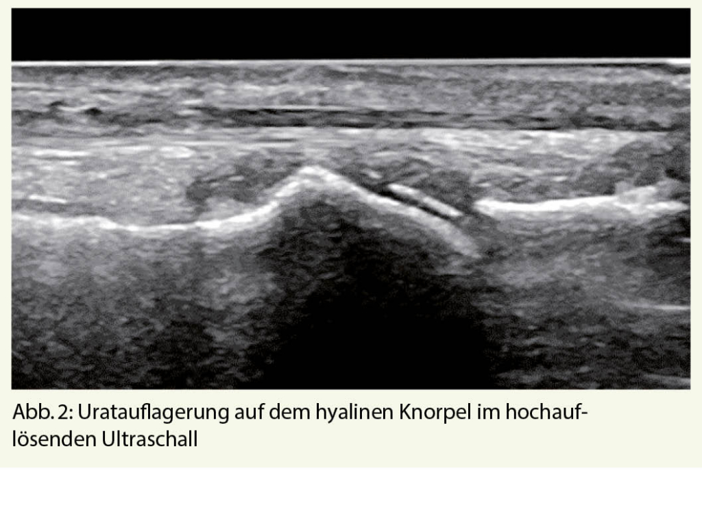 Die akute Gichtarthritis ist meist eine perakut auftretende Monarthritis (mit starken Schmerzen, Rötung und Schwellung), die bevorzugt an der unteren Extremität auftritt. Je typischer die Klinik, desto wahrscheinlicher ist die Diagnose. Allerdings müssen differentialdiagnostisch stets ein Infekt oder eine Pseudogicht (Chondrokalzinose) in Erwägung gezogen werden. Goldstandard für die sichere Diagnose bleibt weiterhin der mikroskopische Nachweis von Uratkristallen im Gelenkpunktat (Abb. 1.) (oder Gewebe) oder von Uratablagerungen im hochauflösenden Ultraschall (Abb. 2.) oder allenfalls Dual-Energy-CT (beide bildgebenden Methoden sind sehr spezifisch, erfordern aber eine gewisse Menge an Uratablagerung für den Nachweis, und können somit gerade im Frühstadium auch falsch negativ sein).