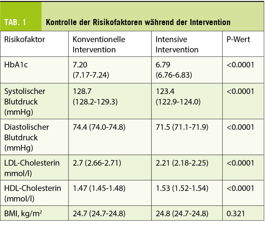 Behandlungsziele unter intensivierter Therapie: HbA1c unter 6.2%, Blutdruck unter 120/75mmHg, LDL-Cholesterin unter 2.0mmol/l. Behandlungsziele unter Standardtherapie: HbA1c unter 6.9%, Blutdruck unter 130/80mmHg, LDL-Cholesterin unter 3.0mmol/l).