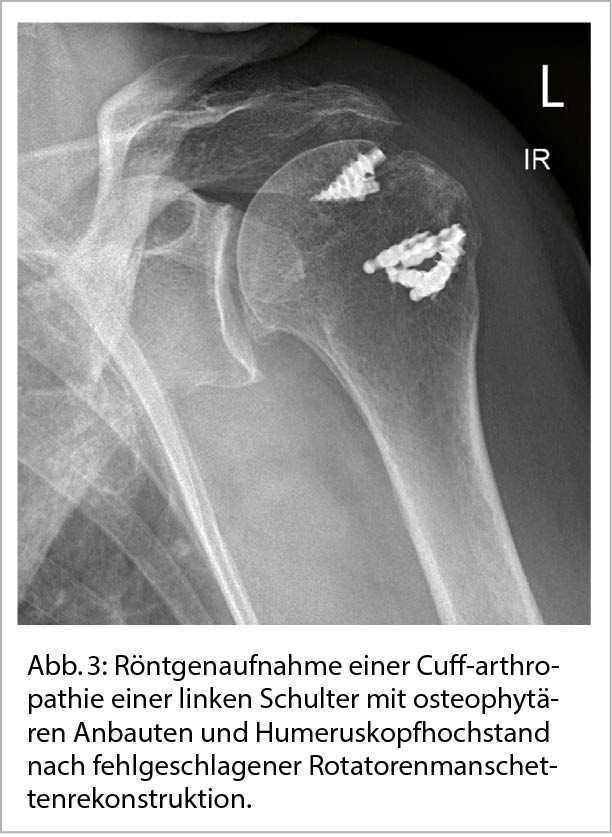 Eine sehr häufige Form der sekundären Schultergelenksarthrose ist die sogenannte Cuff-Arthropathie bei Patienten mit ausgeprägten Rotatorenmanschettenrupturen und konsekutivem Humeruskopfhochstand (Abb. 3) (4).