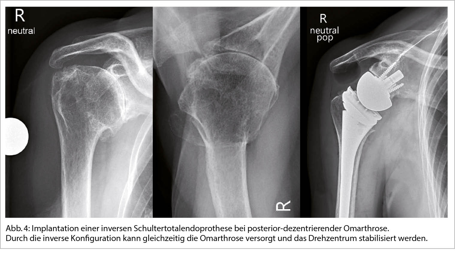 Wichtige Strukturen, die zur Zentrierung des Humeruskopfes beitragen sind knöchern die Schultergelenkspfanne sowie weichteilig die Muskeln und Sehnen der Rotatorenmanschette. Exzentrische Omarthrosen aufgrund einer schwerwiegenden Pfannendeformität und statischer Dezentrierung des Oberamkopfes oder aufgrund einer Rotatorenmanschetteninsuffizienz mit instabilem Gelenksdrehzentrum sprechen für die Implantation einer inversen Schulterendoprothese. Der Anteil der implantierten inversen Endoprothesen ist in den letzten Jahren aufgrund der vielfältigen Indikationserweiterungen und nicht zuletzt aufgrund der sehr guten und verlässlich erzielbaren Ergebnisse kontinuierlich gestiegen. Während die inverse Endoprothese durch das stabilere Drehzentrum überzeugt, ist bei der anatomischen Endoprothese das durchschnittlich zu erwartende postoperative Bewegungsausmass grösser. Bei Verlust der Stabilität des Drehzentrums im Verlauf nach Implantation einer anatomischen Schultertotalendoprothese aufgrund einer sekundären Rotatorenmanschetteninsuffizienz oder eines zunehmenden exzentrischen Pfannenabriebes ist der Wechsel auf eine inverse Prothese möglich (13).