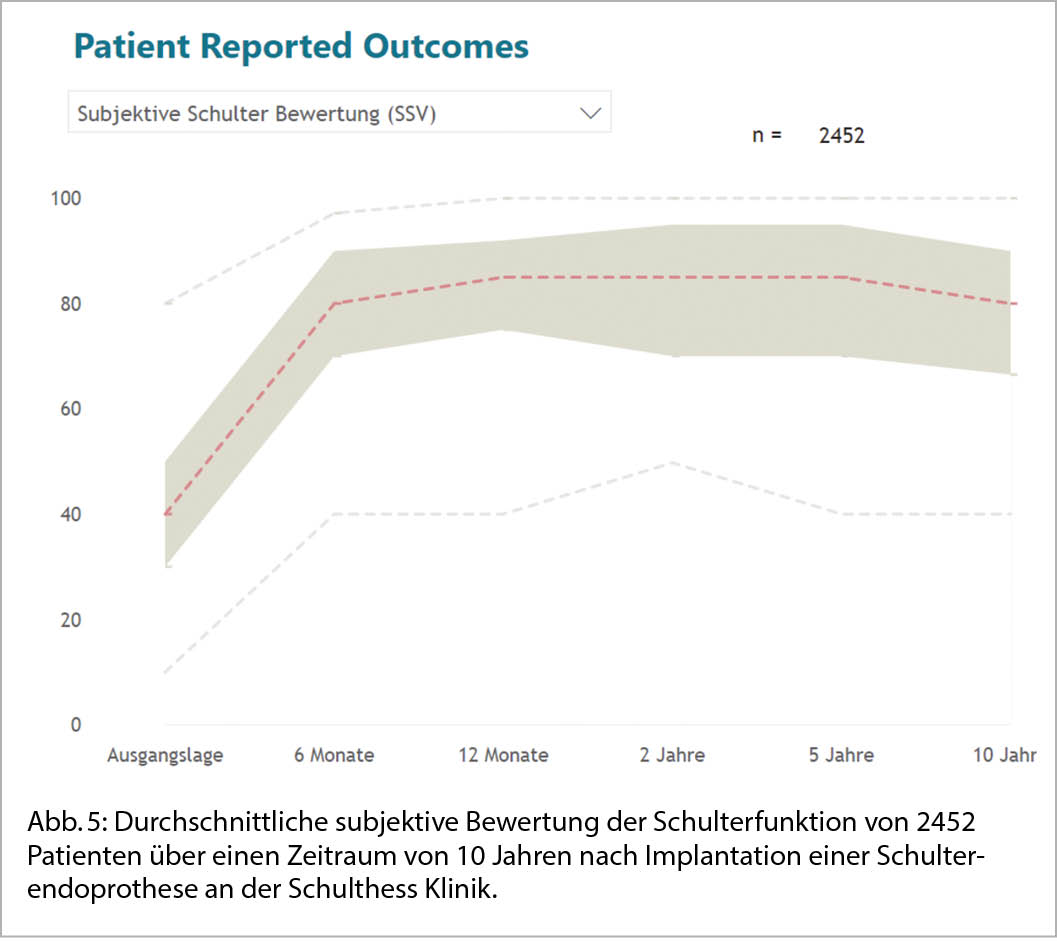 Generell, kann unabhängig von der Art der gewählten Schulterendoprothese bei Patientinnen und Patienten, die unter einer der verschiedenen Formen der Omarthrose leiden, eine zuverlässige Verbesserung der Schmerzen und des Bewegungsumfanges erreicht werden und über einen langen Zeitraum die Lebensqualität deutlich verbessert werden (Abb. 5).