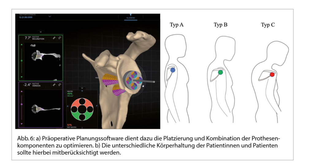 Präoperative Planungssoftware wird genutzt um die Platzierung und Kombination der Prothesenkomponenten zu simulieren und so intra- und postoperative Komplikationen aufgrund von Fehlimplantation und mechanischer Konflikte zu vermeiden.[14] In eigenen Arbeiten konnten wir zudem auf die Wichtigkeit der Miteinbeziehung der Patienten-individuellen Körperhaltung auf die präoperative Planung von Schulterendoprothesen zur Verbesserung des Bewegungsausmasses hinweisen (15). Eine angepasste Auswahl von Implantatkomponenten scheint in der Lage zu sein, die negativen Auswirkungen von häufig vorkommender kyphotischer Fehlhaltung auf das erzielbare Bewegungsausmass abzuschwächen (Abb. 6) (16).
