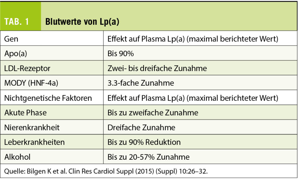 Lp(a)-Plasmawerte werden hauptsächlich genetisch durch den LPA-Genlokus kontrolliert, der durch einen umfangreichen Grössenpolymorphismus von apo(a) gekennzeichnet ist. Dieser Grössenpolymorphismus wird durch eine variable Anzahl verschiedener KIV-2-Wiederholungen verursacht. Die Grösse von Lp(a) ist sehr variabel und reicht von 300 bis 800 kDa. Personen mit kleinen apo(a)-Isoformen haben im Vergleich zu solchen mit grossen apo(a)-Isoformen höhere mediane Lp(a)-Spiegel. Die KIV-2-Kopienzahlvariationen allein erklären 19-77% der Variation der Lp(a)-Spiegel (7). Die Blutwerte von Lp(a werden vor allem durch die Genetik beeinflusst (Tab. 1).