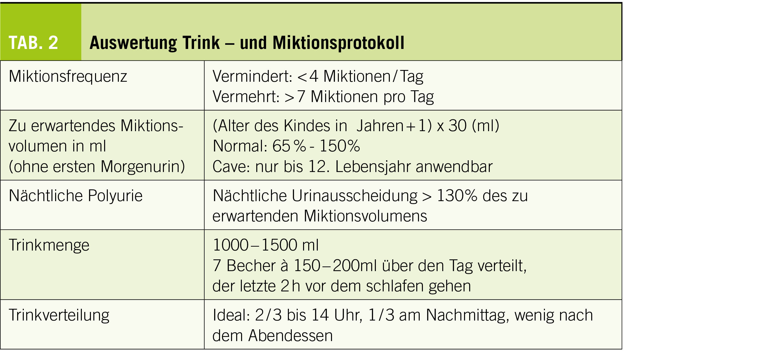 Was im individuellen Fall gestört ist, kann man aufgrund der Protokolle sowie der Anamnese erklären: z.B. nächtliche Polyurie, kleine Blasenkapazität (Tab. 2).