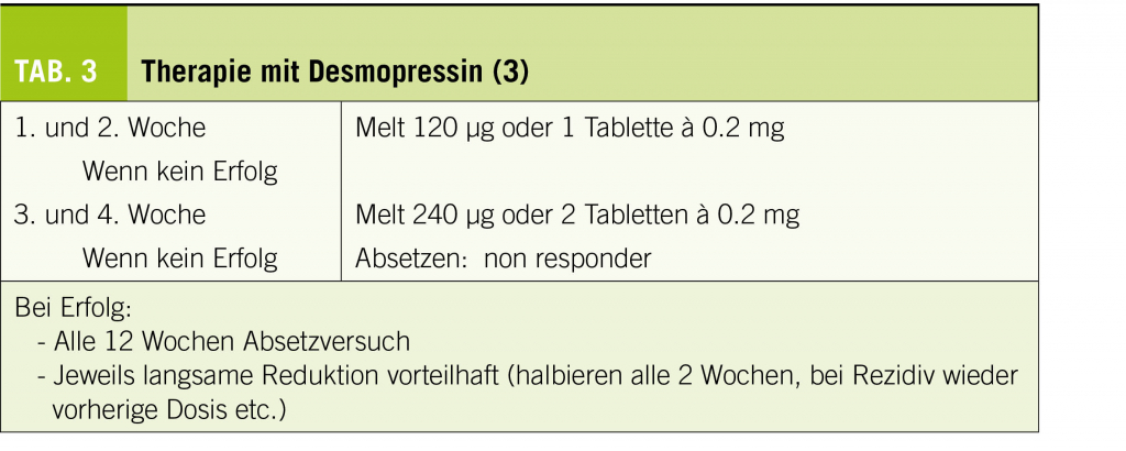 Als Analogon von Arginin-Vasopressin reduziert Desmopressin die nächtliche Urinmenge (8). Indiziert ist es bei therapieresistenten Formen der Enuresis, bei nächtlicher Polyurie sowie bei der Notwendigkeit von kurzfristigem Trockenwerden (z.B. vor Schulausflügen etc.). Ebenso können die fehlende Motivation für eine apparative Verhaltenstherapie oder die Unmöglichkeit der Durchführung derjenigen als Therapiegrund gelten. Für die Indikation Enuresis sind eine Tablettenform und eine Schmelztablette (Melt) zugelassen. Bei Einhaltung entsprechender Vorsichtsmassnahmen – 2 h vor dem Schlafengehen möglichst nichts mehr trinken – ist Desmopressin in der Anwendung sicher. Der primäre Behandlungserfolg ist gross, wird das Medikament aber abrupt abgesetzt, kommt es sehr häufig zu Rezidiven. Der langfristige Erfolg liegt bei 18 – 38%. Eine schrittweise Dosisreduktion über mehrere Wochen kann zu besseren Langzeitresultaten führen (Tab. 3) (9).