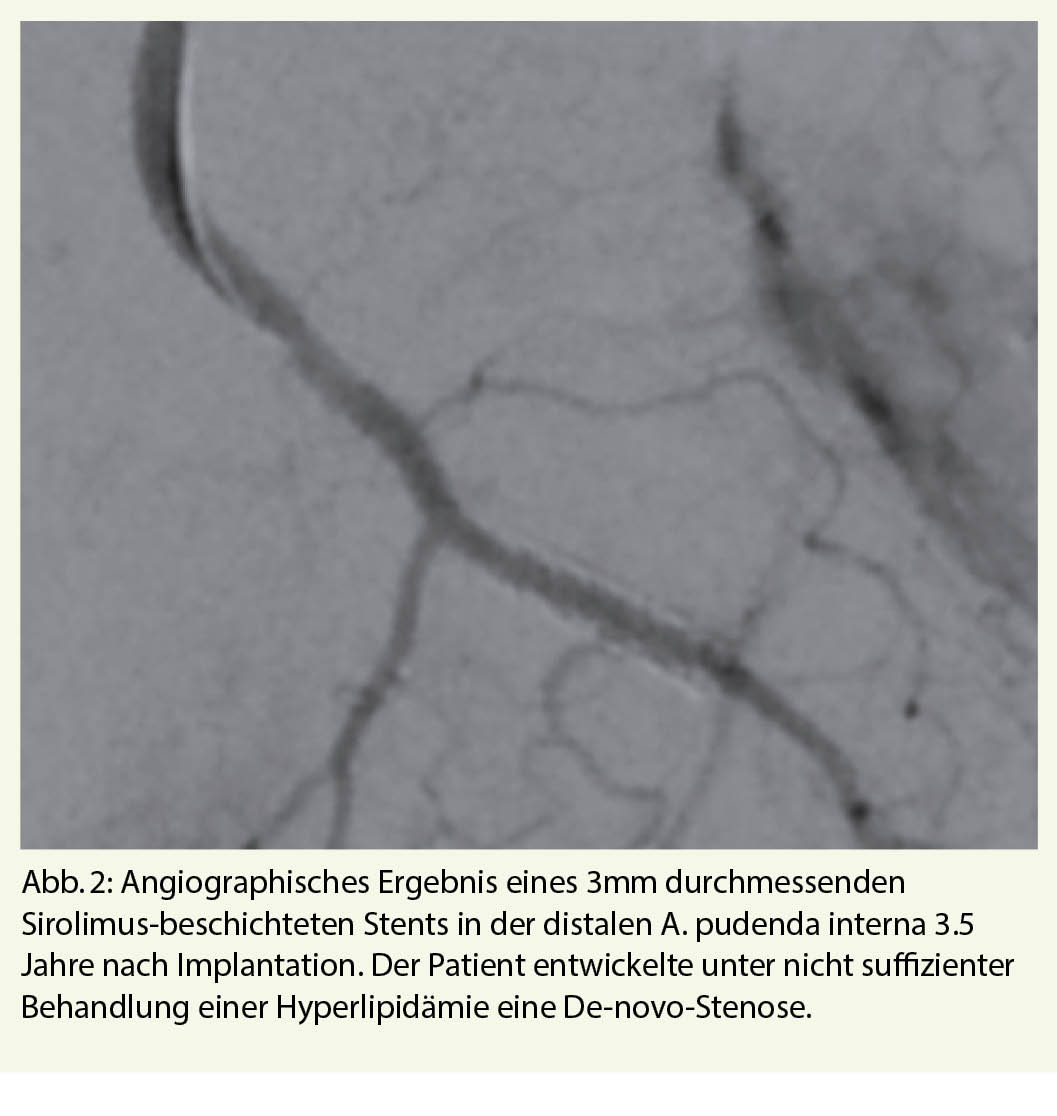 Gemäss der aktuellen Literatur, die in einer Meta-Analyse zusammengefasst ist, erreichen im Schnitt zwei Drittel aller revaskularisierten Patienten nach dem minimal-invasiven Eingriff eine suffiziente Erektion (24). Unter Verwendung modernster Medikamenten-beschichteter Stents ist die Restenoserate nach Wiedereröffnung dieser kleinkalibrigen Arterien mit 15% vergleichsweise gering (25) (Abb. 2).