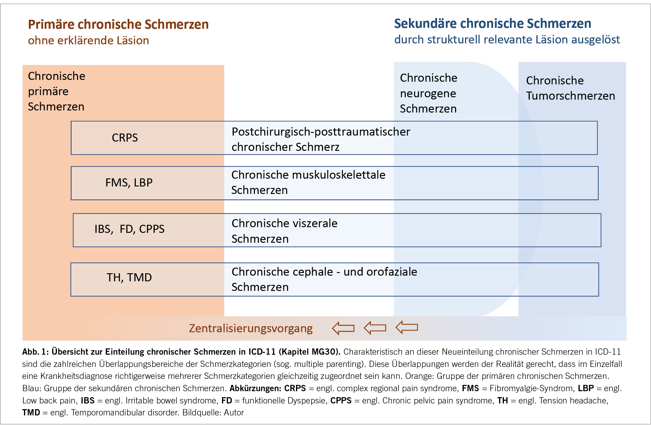ICD-11 führt im Kapitel MG30 chronischen Schmerz als eine eigenständige Krankheits-Gruppe auf. Wert- und wortneutral unterteilt ICD-11 zwischen den beiden Hauptkategorien der sog. primären und sog. sekundären chronischen Schmerzen. Der Unterschied ist, naler Auslöser fassbar ist, auf dessen Grundlage sekundär eine chronische Schmerzerkrankung entsteht. Bei den primären chronischen Schmerzen ist diese Bedingung nicht nötig.