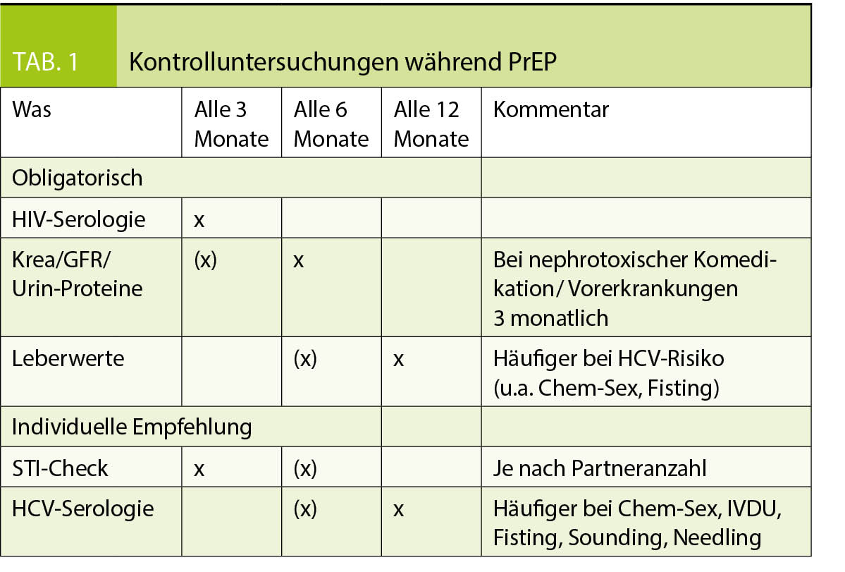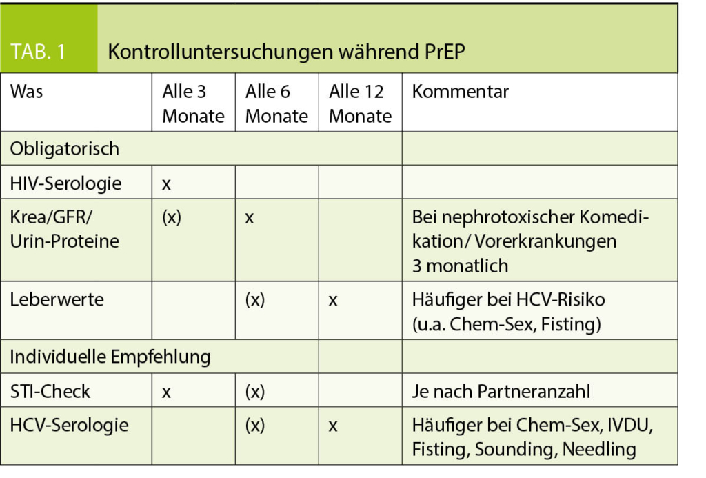 Eine PrEP sollte nicht durchgeführt werden bei einer HIV-Infektion, signifikanten Proteinurie und/oder einer Nierenfunktion mit GFR < 50 ml/min. Bei chronischen Nierenerkrankungen mit einer GFR > 50 ml/min, Osteoporose oder sonstigen Vorerkrankungen, die das Risiko für Nebenwirkungen der PrEP erhöhen, muss dies sorgfältig mit den Personen besprochen werden und das Nutzen-Risiko-Profil analysiert werden und falls eine PrEP durchgeführt wird allenfalls auch engmaschigere Kontrollen. Bei einer chronischen Hepatitis B kann eine PrEP durchgeführt werden, allerdings nur mit täglicher Einnahme und nicht event-basiert. In diesem Fall lohnt sich die Zuweisung zu einem Infektiologen. Während der PrEP-Einnahme empfehlen wir die folgenden Kontrollen gemäss der Tabelle 1.