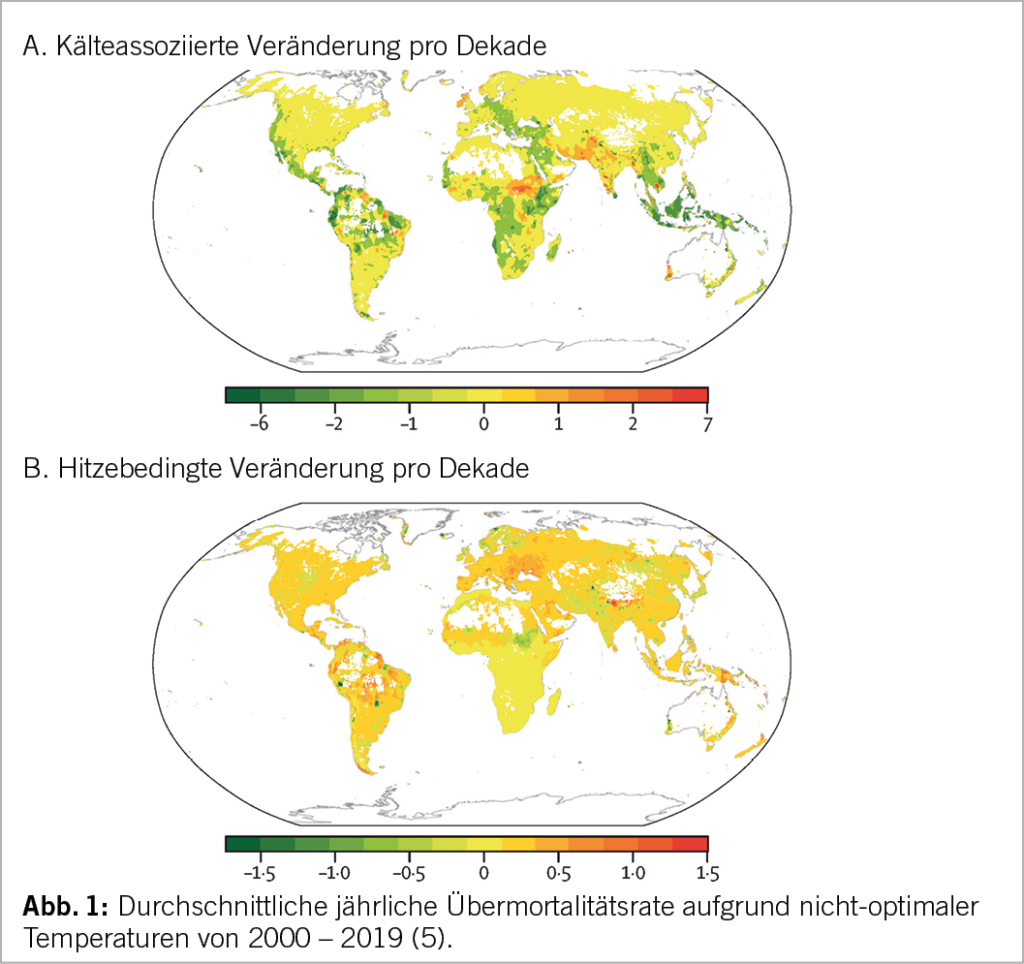 Das «Multi-Country Multi-City» (MCC) Collaborative Research Network sammelt seit 2014 überregional Daten zur temperatur-assoziierten Mortalität und deckt an 750 repräsentativen Orten aktuell 46.3% der weltweiten Fläche ab. In einer von ihren kürzlich publizierten Studien führten Zhao Q. et al. 9.4% der globalen Mortalität oder einen Sterblichkeitsüberschuss von 74 auf 100‘000 Einwohner auf extreme Umgebungstemperaturen zurück (5). Die Übermortalität war dabei in Kälteperioden höher (8.52%) als während Hitzeperioden (0.91%). Insgesamt nahmen aber die kälteassoziierten Todesfälle seit dem Jahr 2000 um 0.51% ab, währendem die hitzebezogene Todesrate um 0.21% zunahm.