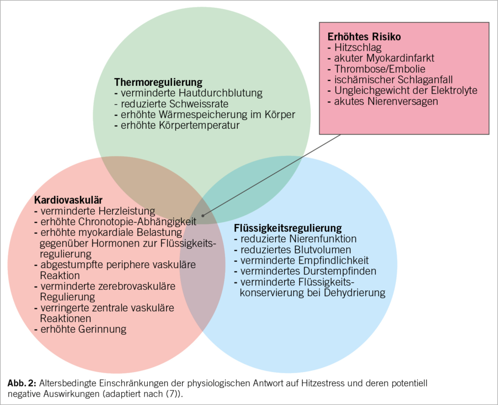 Solange die Wärmeabgabe den Wärmezuwachs auszugleichen vermag (kompensierbarer Zustand), wird sich die Körpertemperatur stabilisieren, wenn auch auf einem höheren Level. Im Gegensatz dazu können heissere oder feuchtere Bedingungen dazu führen, dass die Kapazität der Wärmeabgabe durch die Umgebungsbedingungen überfordert wird. In solchen Situationen des nicht kompensierbaren Zustandes wird die anhaltende Exposition zu einem progressiven Anstieg der Körpertemperatur führen und die Gesundheit gefährden (9). Dabei nimmt die thermoregulatorische Funktion mit zunehmendem Alter ab. Die Ursache ist multifaktoriell und beinhaltet die Abnahme der Bio-Verfügbarkeit von Stickstoff-Monoxid, eine Verminderung der autonomen Kontrolle der Autozirkulation und der kardialen Reserven sowie ein geringeres Ansprechen der Schweissdrüsen auf Veränderungen der Körpertemperatur (13).