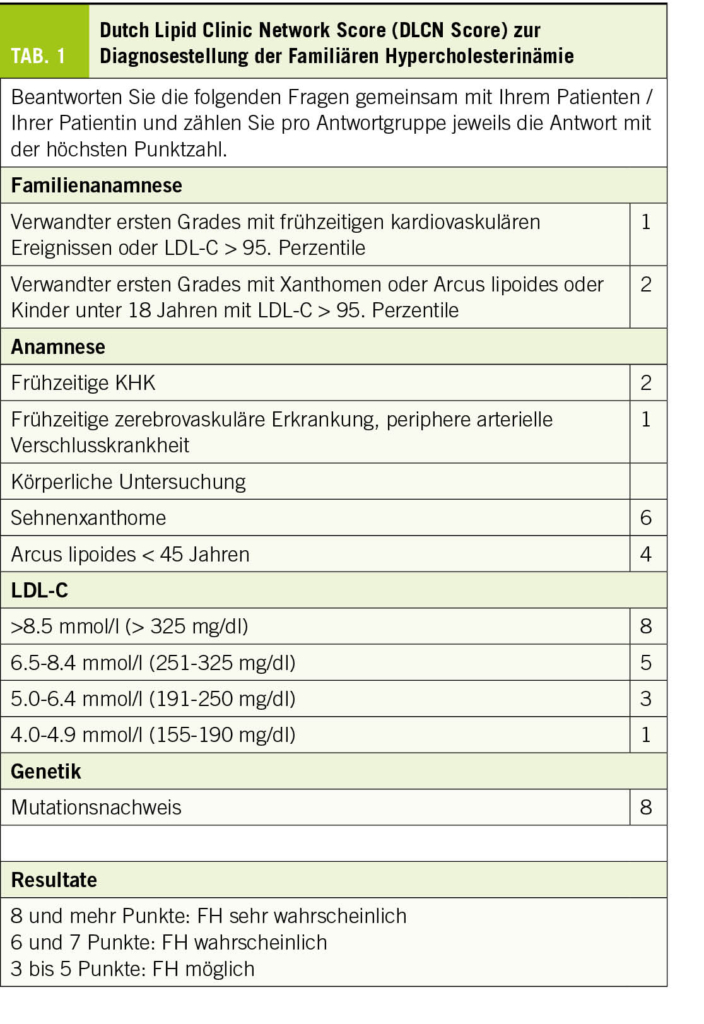 ◆ Die Indikation für eine genetische Untersuchung kann mit dem DLCN Score ermittelt werden.