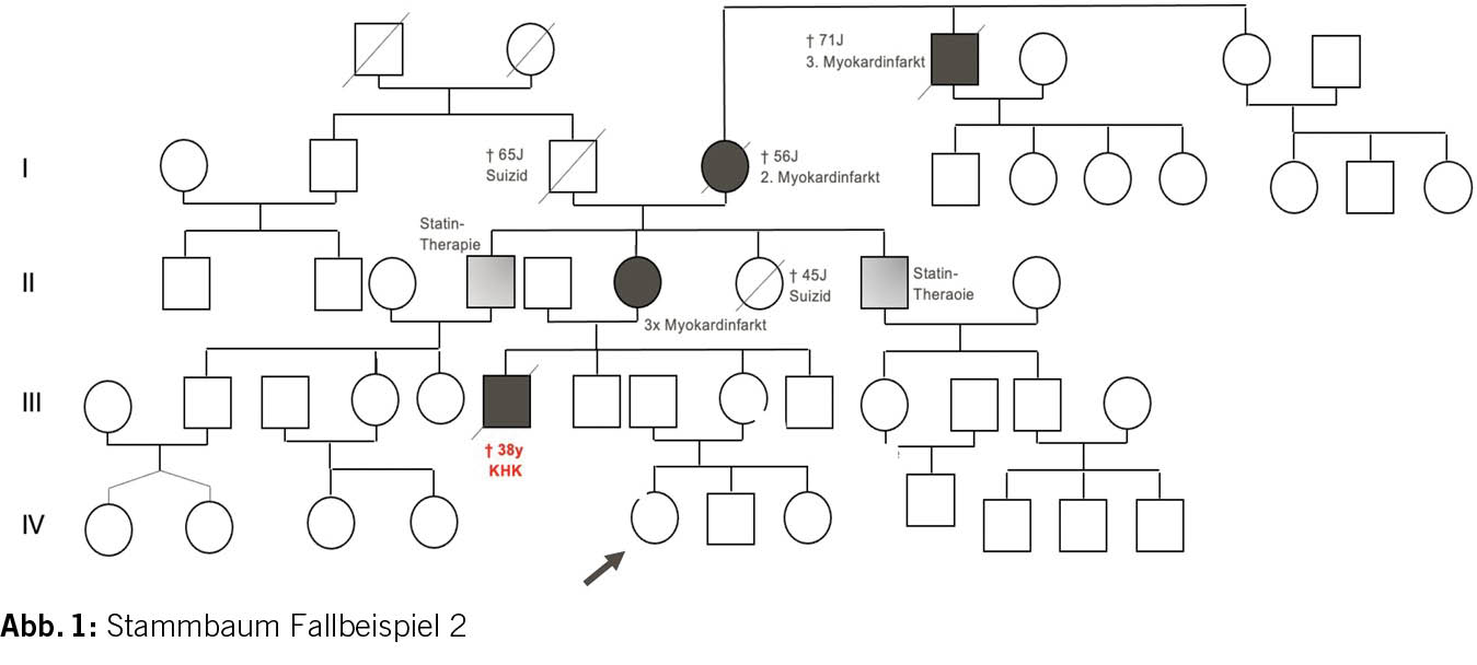 Eine 26-jährige Frau mit Kinderwunsch und belasteter Familiengeschichte mütterlicherseits bezüglich kardiologischen Auffälligkeiten fragt nach einer genetische Beratung. Die Stammbaumanalyse zeigt eine auffällige Ausgangslage: Unter anderem war ihr Onkel mit 38 Jahren an einer koronaren Herzerkrankung gestorben, ihre Grossmutter erlitt drei Myokardinfarkte in jüngerem Alter und deren zwei Brüder nahmen Statine zur Cholesterin-Senkung.