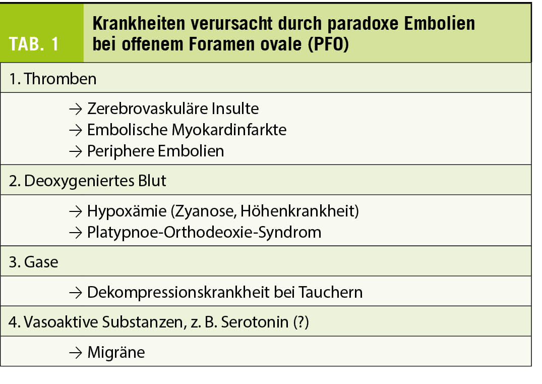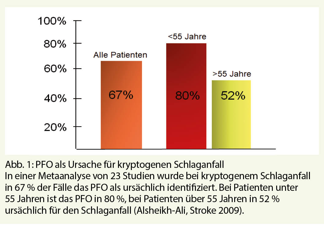 Ein PFO findet sich bei etwa 25 % der Bevölkerung. Obwohl bereits vor 150 Jahren das gleichzeitige Vorkommen von Lungenembolien und peripheren Embolien bei Patienten mit weit offenem PFO beschrieben wurde, wurde erst 1988 die erhöhte Prävalenz eines PFO bei jungen Patienten mit kryptogenem Schlaganfall aufgezeigt (1). Durch das PFO können neben thrombotischem Material auch Gase, entsättigtes Blut oder vasoaktive Substanzen vom venösen in den arteriellen Kreislauf gelangen und zu den entsprechenden Krankheitsbildern führen (Tab. 1). Klinisch am bedeutungsvollsten ist allerdings die paradoxe Embolie als Ursache des kryptogenen Schlaganfalls. Nach einem kryptogenen Schlaganfall gilt es, das PFO zu suchen und nachher zwischen einem inzidentellen PFO und einem ursächlichen PFO zu unterscheiden. In einer Metaanalyse von 23 Studien wurde gezeigt, dass ca. ein Drittel der PFOs inzidentell sind und 67 % ursächlich (Abb. 1) (2). Je jünger der Patient ist, umso wahrscheinlicher ist das PFO und eine dadurch mögliche paradoxe Embolie ursächlich für den kryptogenen Schlaganfall. Bei unter 55-jährigen Patienten ist nach kryptogenem Schlaganfall und Vorliegen eines PFOs dasselbe in 80 % ursächlich für den Schlaganfall.