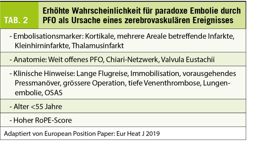 Wird bei einem Patienten mit kryptogenem Schlaganfall ein PFO gefunden, kann die Wahrscheinlichkeit, dass das PFO ursächlich ist, nicht nur aufgrund des Alters, sondern auch aufgrund des Embolisationsmusters im Hirn, der Anatomie des PFOs und aufgrund klinischer Hinweise abgeschätzt werden (Tab. 2). Gleichzeitig bestehende venöse Thrombosen oder Lungenembolien sprechen für eine paradoxe Embolie durch das PFO. Da eine paradoxe Embolie, d. h. ein Rechts-Links-Shunt, durch eine Druckerhöhung im rechten Vorhof begünstigt wird, wird das Auftreten eines Schlaganfalls nach einem Pressmanöver, wie z.B. nach dem morgendlichen Toilettengang, beim Trompete oder anderen Blasinstrument spielen, beim Aufheben schwerer Last etc., die Wahrscheinlichkeit eines ursächlichen PFOs erhöhen. Die Wahrscheinlichkeit, dass der kryptogene Schlaganfall dem PFO geschuldet ist, wird häufig auch anhand des RoPE-Scores abgeschätzt. Der RoPE-Score verwendet das Alter des Patienten, die kardiovaskulären Risikofaktoren und das Embolisationsmuster im Hirn sowie vorausgegangene Schlaganfälle, um die Wahrscheinlichkeit vorauszusagen (3). Obwohl der RoPE-Score häufig verwendet wird, ist er schlecht validiert und für sich alleine als Entscheidungsgrundlage nicht geeignet (4).