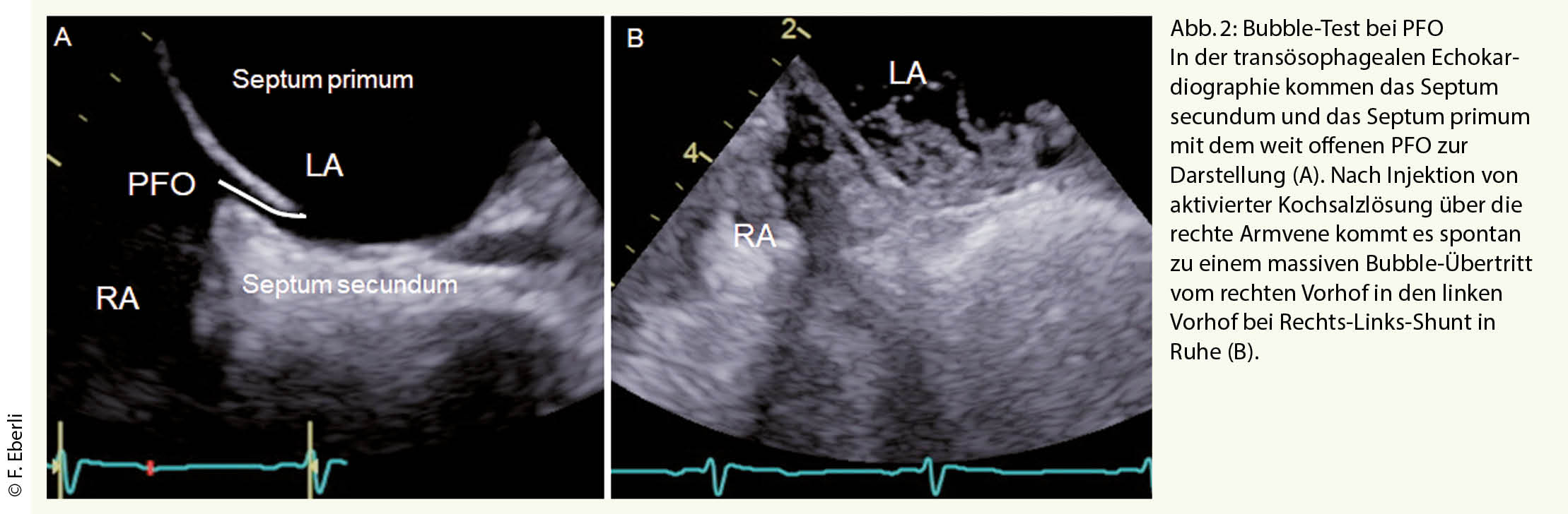 Die transthorakale Echokardiographie dient zum Ausschluss einer kardio-embolischen Quelle. Liegt keine Pathologie am Myokard oder den Klappen vor oder besteht der Verdacht auf eine paradoxe Embolie durch das PFO wird eine transoesophageale Echokardiografie (TEE) angeschlossen. Meist wird bereits bei der transthorakalen Echokardiografie, sicher aber bei der TEE ein Bubble-Test durchgeführt (Abb. 2) um festzustellen, ob ein Rechts-Links-Shunt in Ruhe vorliegt oder mittels eines Valsalva Manövers provoziert werden kann. Die TEE ermöglicht zum einen den Ort des Rechts-Links-Shunts zu eruieren, zum anderen Shuntvitien wie ein Vorhofseptumdefekt, falsch mündende Lungenevenen oder eine pulmonale A-V Malformation auszuschliessen. Mittels TEE wird die Morphologie und Anatomie des PFO und des Vorhofs visualisiert, was wichtig ist für einen eventuellen PFO Verschluss. Die Evaluation der Grösse des PFOs in der TEE ist jedoch problematisch, da das Septum primum deckelförmig mehr oder weniger aufgeht und der Bubble-Übertritt damit von der Qualität des Valsalva-Manövers abhängt (Abb. 2). In der TEE kommt in der 2-D Darstellung die schlitzförmige Öffnung des PFO meist als kleine Lücke von 1-4 mm zur Darstellung. In Wirklichkeit variiert die anatomische Grösse des PFO von 4 bis 16 mm, im Mittel beträgt sie 8 ± 3 mm (6, 7).