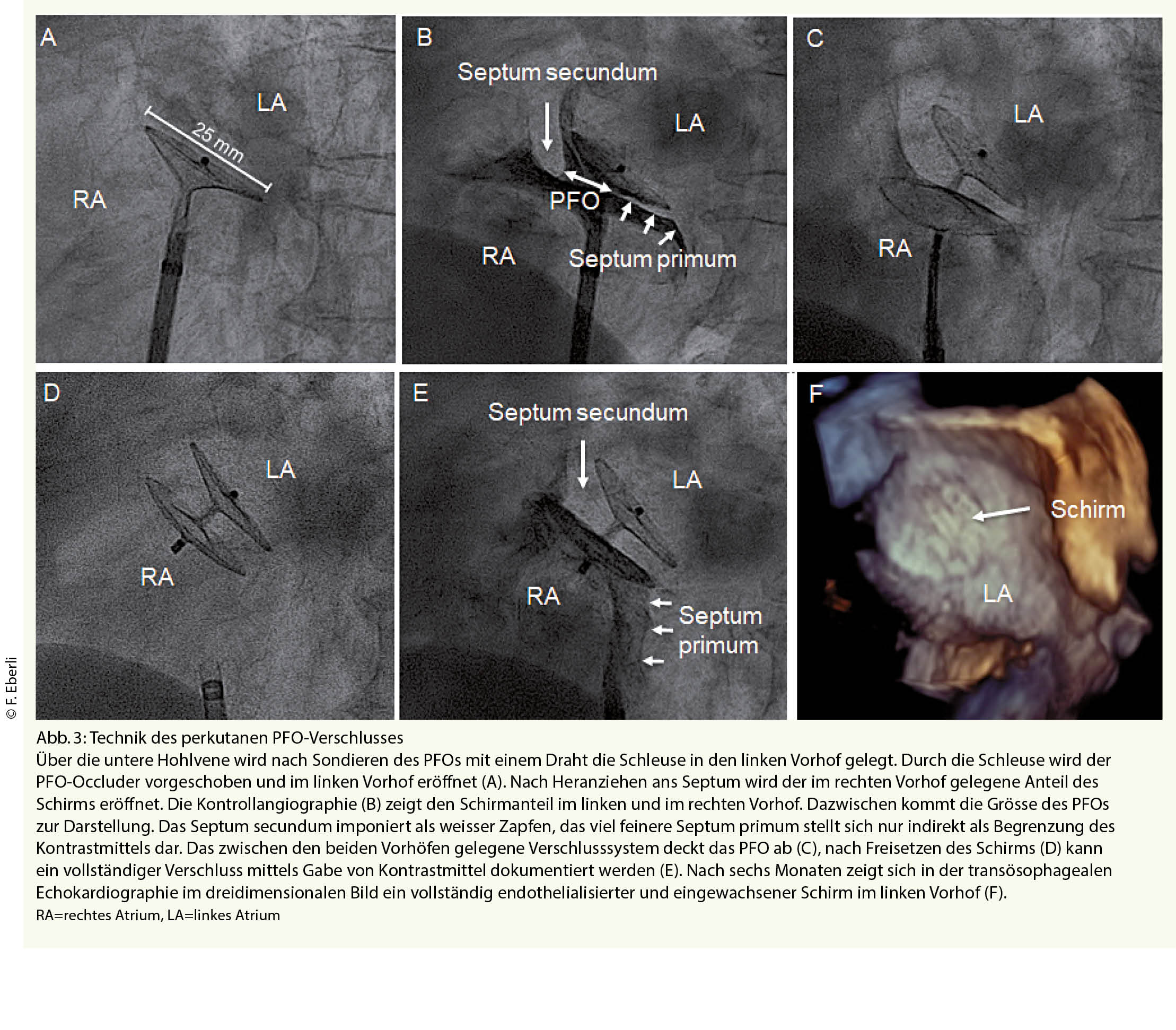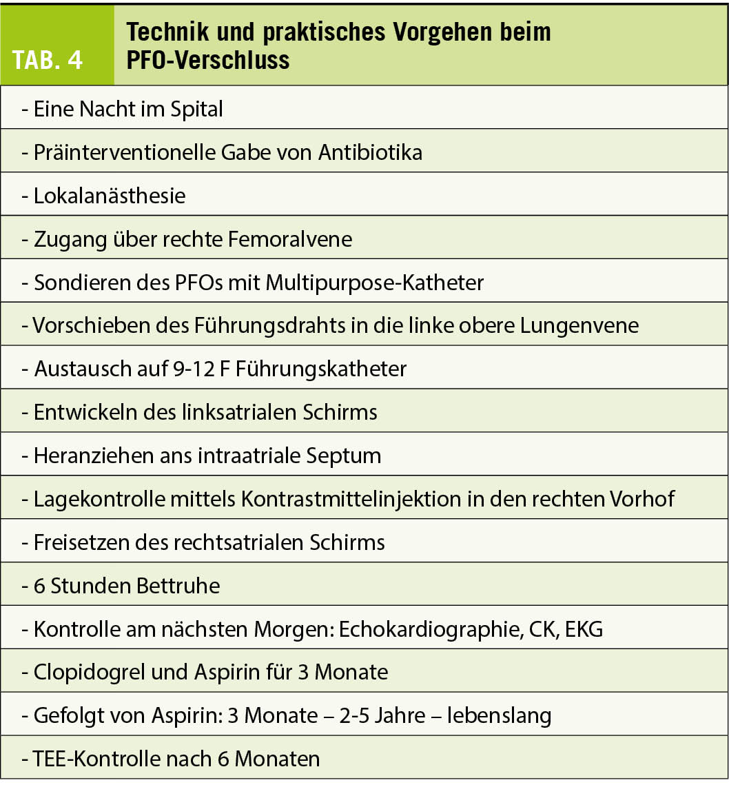 Der perkutane PFO-Verschluss wird in vielen Zentren unter Überwachung mittels Angiografie und TEE durchgeführt, was meist eine Vollnarkose nötig macht. Der PFO Verschluss ist auch mittels angiografischer Überwachung allein und bei Bedarf dem Einsatz einer intrakardialen Echokardiografiesonde, möglich. Allerdings ist eine vorgängige, qualitativ genügende TEE nötig, um den Eingriff zu planen. In der Tabelle 4 sind die Technik und das praktische Vorgehen wie es am Stadtspital Triemli praktiziert wird aufgeführt. Das Verschlusssystem wird über den Führungskatheter, welcher nach dem Sondieren des PFOs in der linken oberen Lungenvene oder im linken Vorhof liegt, eingeführt. Der linksatriale Anteil des Verschlusssystems wird im linken Vorhof eröffnet (Abb. 3A). Er entfaltet sich wie ein Schirm. Daher der Name Schirmverschluss. Der «Schirm» wird nun gegen das interatriale Septum gezogen und fasst das Septum primum und Septum secundum (Abb. 3B). Mittels Kontrastinjektion in den rechten Vorhof über den Führungskatheter wird die Position überprüft. Dann wird der rechtsatriale «Schirm» entfaltet und eine erneute Kontrolle der Position des PFO-Occluders durchgeführt (Abb. 3C). Bei guter Position wird der Occluder freigesetzt (Abb. 3D). Die Kontrolle am nächsten Tag umfasst eine transthorakale Echokardiographie zur Überprüfung der Lage des Occluders, eine Laborkontrolle zur Sicherstellung, dass keine kardiale Schädigung aufgetreten ist (CK, Troponin) und das Aufzeichnen eines EKGs zum Dokumentieren, dass der Patient nicht im Vorhofflimmern ist. Nach sechs Monaten wird eine Kontrollechokardiographie durchgeführt zur Überprüfung des vollständigen Einwachsens des Occluders (Abb. 3F).