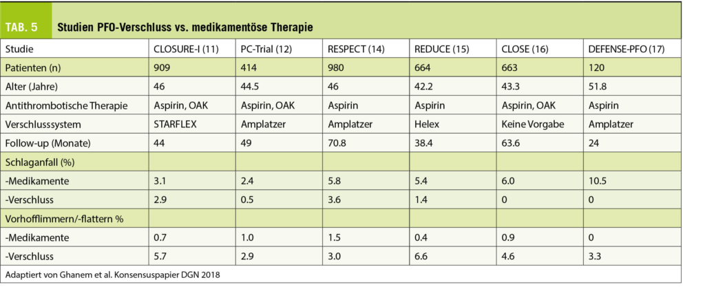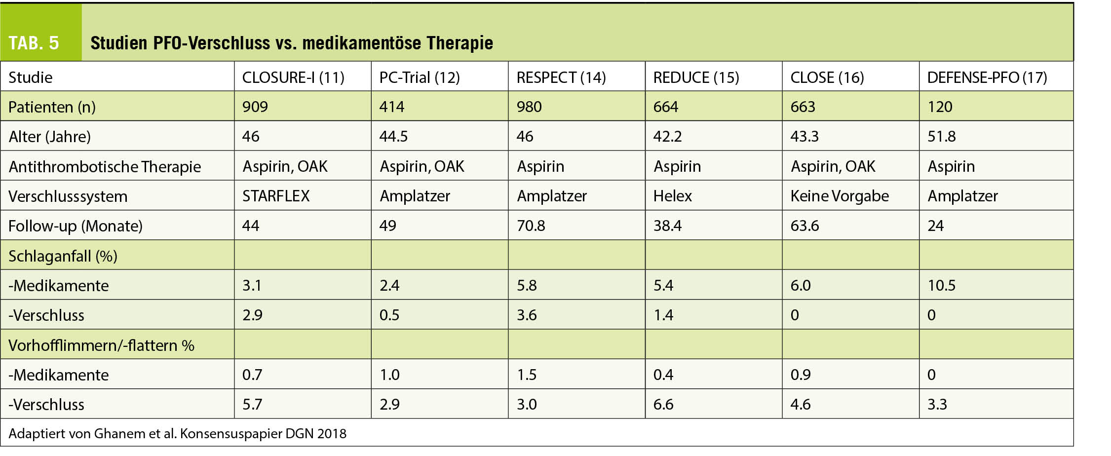 Aufgrund der Pathophysiologie der paradoxen Embolie bietet sich der Verschluss des PFOs für eine optimale Sekundärprävention an. Leider haben die ersten randomisierten Studien (CLOSURE I (11), PC-Trial (12), RESPECT (13), welche eine medikamentöse Therapie (Aspirin oder OAK) gegen den perkutanen PFO-Verschluss verglichen haben, keinen signifikanten Vorteil für den PFO-Verschluss gebracht. Die Ursachen für dieses neutrale Ergebnis waren neben einer suboptimalen Patientenselektion, eine niedrigere als erwartete Ereignisrate, eine zu kurze Nachbeobachtungszeit, viele «Crossovers» (12, 13) und Komplikationen durch ein schlechtes Verschlusssystem (11). Eine Verlängerung der Nachbeobachtungszeit hat denn auch im RESPECT-Trial den Vorteil des PFO-Verschlusses gegenüber der medikamentösen Therapie gezeigt (14). In der Folge wurden von Neurologen Studien durchgeführt, nämlich die REDUCE-Studien (15) und die CLOSE-Studie (16) und von Kardiologen die DEFENSE-PFO-Studie (17), welche den Vorteil des PFO-Verschlusses zur Verhinderung eines erneuten Schlaganfalls eindeutig belegten (Tab. 5).