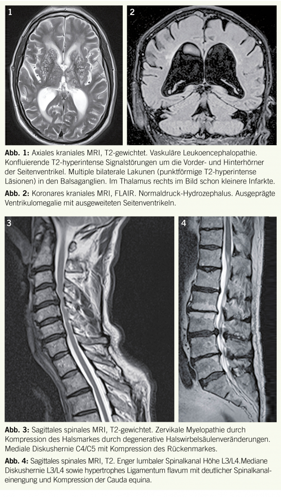 episoden, die Patienten haben seit Jahren multiple vaskuläre Risikofaktoren und oft Zeichen der KHK und/oder PAVK sowie eine Urininkontinenz. Bei der Untersuchung finden sich eine (meist leichte) Spastik, Zeichen der frontalen Enthemmung, sogenannte pseudobulbäre Zeichen (Dysphagie, Dysarthrie, emotionale Labilität) und Zeichen einer demenziellen Entwicklung. Beweisend ist in den meisten Fällen die zerebrale Kernspintomographie mit einer ausgeprägten multifokalen und konfluierenden Leukoencephalopathie (Abb. 1).