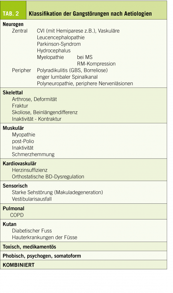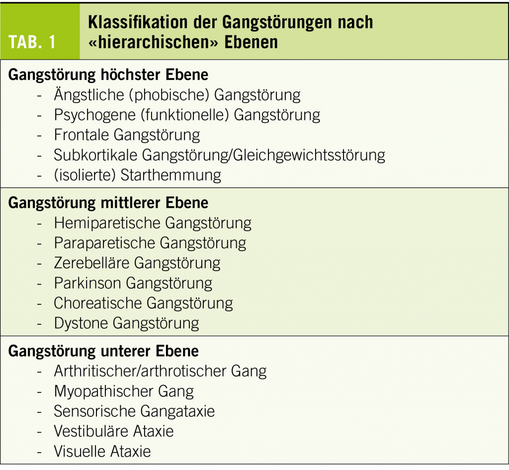Es gibt keine alle Bedürfnisse befriedigende Klassifikation der Gangstörungen. Man kann sie nach «hierarchischer Ebene» einteilen (Tab. 1) oder nach den Ätiologien (Tab. 2) (2).