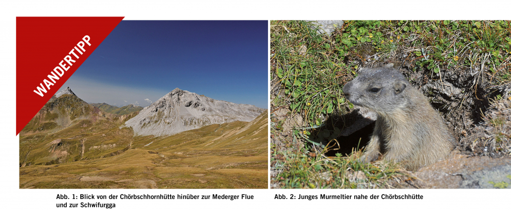 längeren Alpenquerung gezeltet und auf der Mederger Flue den Sonnenuntergang genossen – ein unvergessliches Erlebnis. Wir queren zum Sattel zwischen Wannengrat und Chörbsch Horn und weiterhin gegen Südwesten zur Chörbschhornhütte. Im Westen können wir nun die Schwifurgga zwischen Mederger Flue und Schafgrind sehen, unserem nächsten Ziel, das wir durch das Tälchen des Sutzibachs in kurzer Zeit erreichen (Abb. 1 und 2). Hier wimmelt es nur so von Murmeltieren und wir können ein neugieriges Jungtier aus unmittelbarer Nähe beobachten.