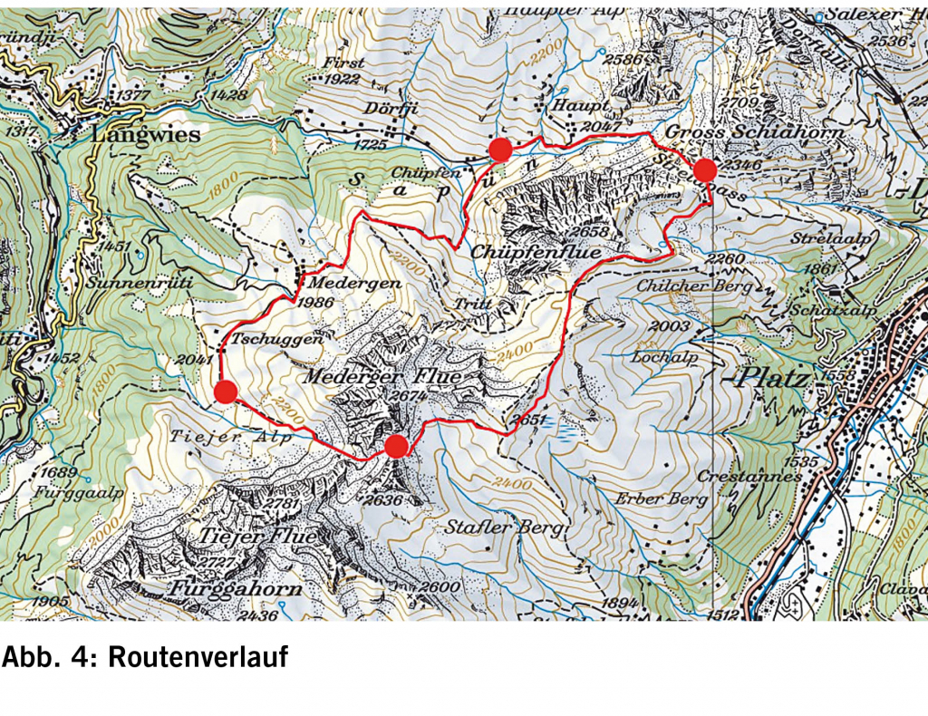 Der Abstieg von der Schwifurgga nach Tieja, zwischen den Kalksteinwänden der Mederger und Tiejer Flue hindurch, ist im oberen Teil sehr abschüssig und rutschig. Vorsicht ist also geboten. Mehrere grosse Murzüge lassen die Gefährlichkeit der Hänge bei lang anhaltendem Regen erkennen. Von Tieja über Tschuggen nach Medergen folgen wir einem Fahrsträsschen (Abb. 3). Herrlich ist dabei der weite Rundblick über das Schanfigg. Im Restaurant Alpenrose kehren wir zu einer Erfrischung ein, bevor wir über eine sanfte Gegensteigung die Wangegg umrunden und über die Chüpferalp in Richtung des gleichnamigen Weilers von Sapün absteigen. Oberhalb von Chüpfen zweigt ein schmaler Pfad ab, über den wir direkt zum Heimeli hinüberqueren können (Abb. 4). Auch hier haben mehrere Murgänge den ehemaligen Weg verschüttet und das Anlegen einer neuen Trasse mit Brücke über den Sapüner Bach notwendig gemacht.