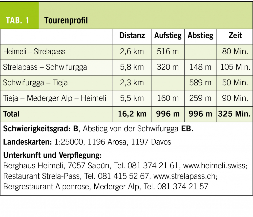 Ausgeruht steigen wir am nächsten Morgen zum Strelapass auf. Die Sicht ist klar und reicht im Osten über das Schanfigg hinaus bis zum Tödi und Oberalpstock. Nach Westen öffnet sich dann das Panorama auf dem weiteren Höhenweg vom Silvretta-Massiv über das Flüela-Wiss- und -Schwarzhorn bis hin zum Piz Kesch und Piz d’Err, zu den Bergeller Bergen sowie gegen den Piz Ela und die Corn da Tinizong hin, um nur einige der markantesten Gebirgsgruppen und Berge zu nennen. Zu unseren Füssen liegen die Täler Flüela, Dischma und Sertig sowie jene im Monsteingebiet.