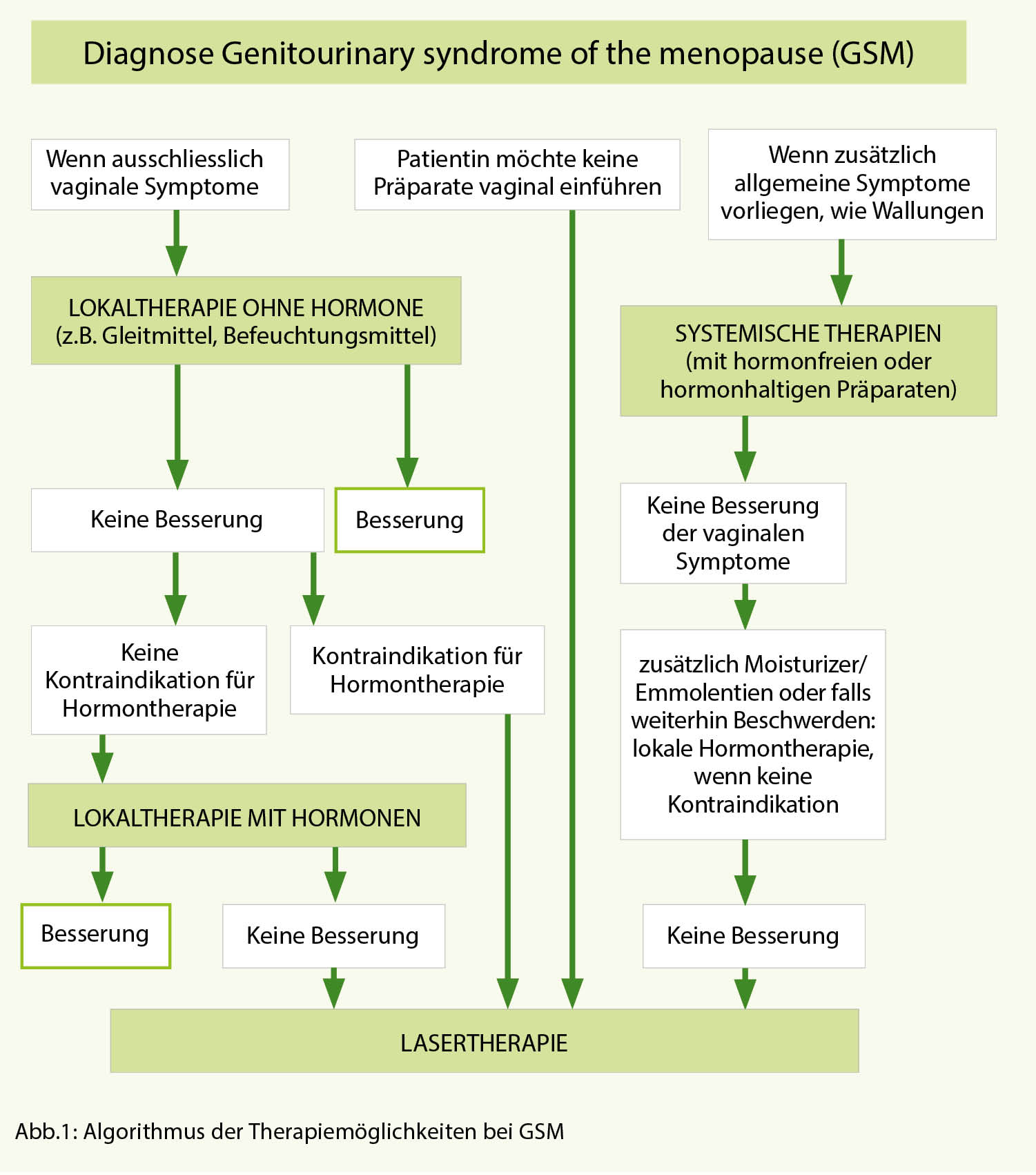 Rund 50% aller Frauen in der Peri- und Postmenopause haben Symptome des «Genitourinary syndrome of the menopause» (GSM). Dieses Syndrom umfasst, ergänzend zur vulvovaginalen Atrophie (VVA), zusätzlich die durch absinkende Hormonspiegel entstehenden Symptome der ableitenden Harnwege. Die Lebensqualität der betroffenen Frauen kann als Folge der Gewebeveränderungen stark eingeschränkt sein. Ziel dieser Übersicht ist die Darstellung der aktuellen Therapiemöglichkeiten und deren stufenweiser Einsatz.